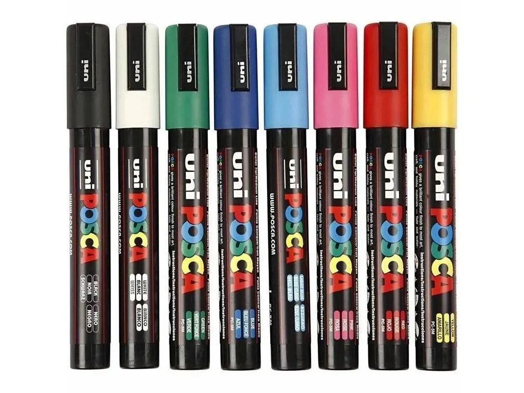 Uni Posca marker PC-5M er perfekt til udendørs dekoration og til plakater. Iøjnefaldende flotte farver selv på sort papir. Kan skrive på de fleste overflader f.eks. metal, glas, plastik, foto og papir. Modstandsdygtig over for lys og vand. Trækker ikke igennem papiret. Vandbaseret og xylenfri blæk. Lugtfri. Stregbredde 1,8-2,5mm