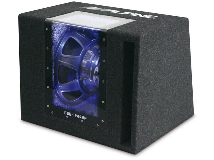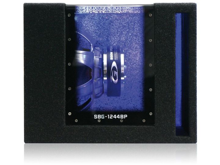 | 12” Type-G Subwoofer Type-G bånd pas Subwoofer kabinet Plexiglas vindue og blå belysning Max belastning: 800 Watt Vedvarende effekt: 250 Watt Mål: (B): 473 mm - (H): 380 mm - (D) 314/414 mm |