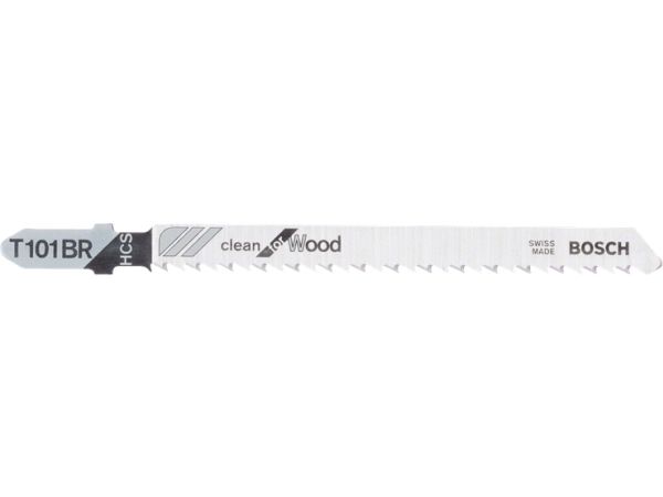 The T 101 BR Clean for Wood Jigsaw Blade delivers clean straight cuts in wood. Its precision-ground teeth with taper-ground body produce clean results. The high carbon steel blade material is appropriate for softwood and non-abrasive woodworking materials. A reverse tooth design cuts tear-free at the top surface. The blade is equipped with a fine progressive tooth pitch (2.5 mm) for cutting woodworking materials with 3-30 mm thickness. For use with jigsaws with T-Shank clamping systems.