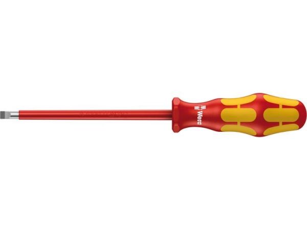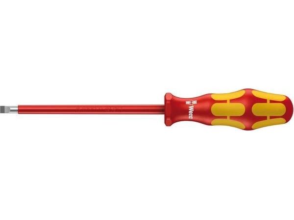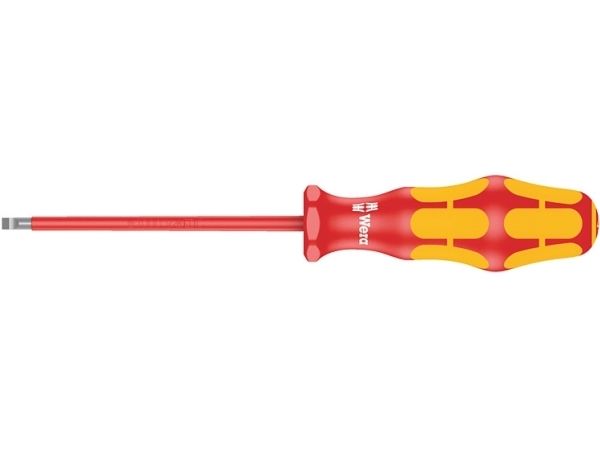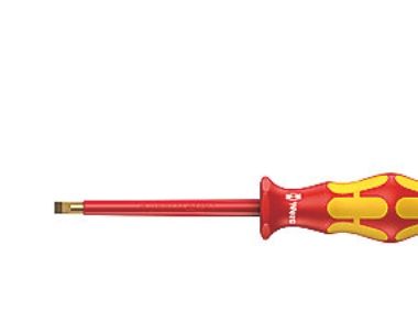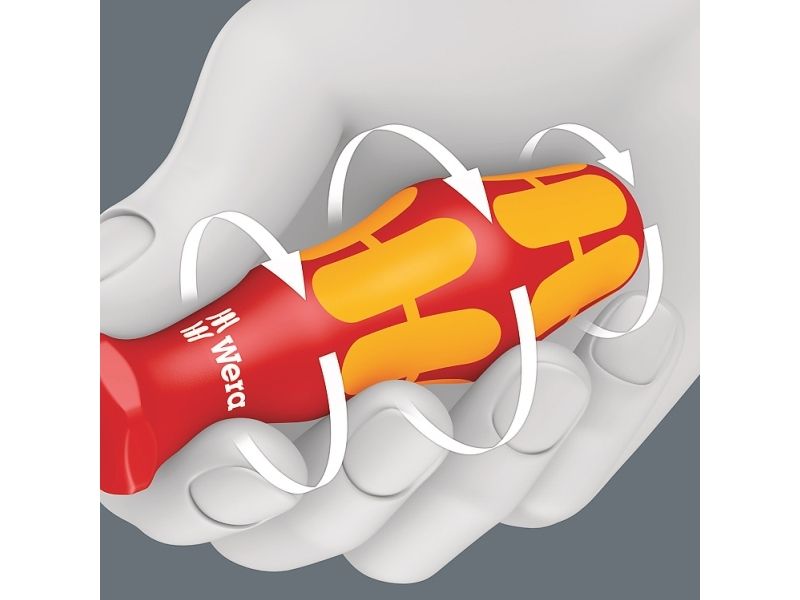 Wera VDE-skruetrækkere med flerkomponent Kraftform Plus-greb til hurtigt og skånsomt arbejde: Hårde grebszoner til høj arbejdshastighed, mens bløde grebszoner sikrer stor momentoverførsel. Enkeltvis test i vandbad ved 10.000 V sørger for sikkert arbejde ved den godkendte spænding på 1.000 V. „Take it easy“ værktøjsfinder med farvemarkering efter profil og størrelsesangivelse – gør det let og hurtigt at finde det rigtige stykke værktøj. Sekskantet rullesikring forhindrer irriterende rullen væk på arbejdsstedet.