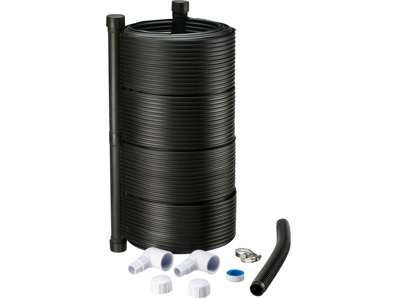 Forleng badesesongen med dette klassiske solfangeranlegget. Solfangeren øker vanntemperaturen i bassenget med 4-6 grader. Dette forutsetter imidlertid at det brukes et termotrekk om natten, slik at varmen ikke forsvinner ut i det blå. Det krever også tilkobling av et bypass-sett (1572), slik at du kan stenge vanngjennomstrømningen om natten og på kjølige dager.
