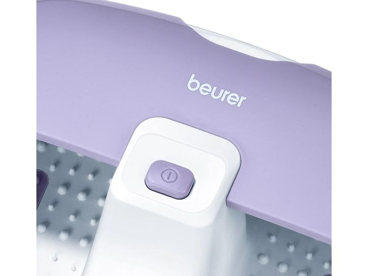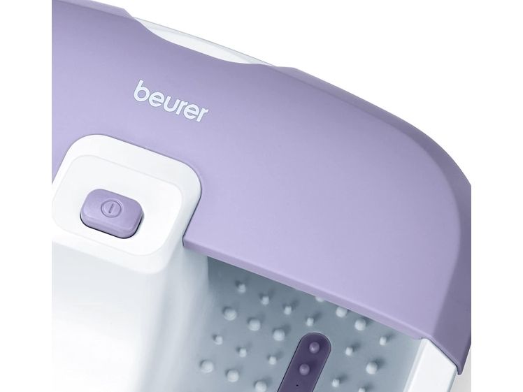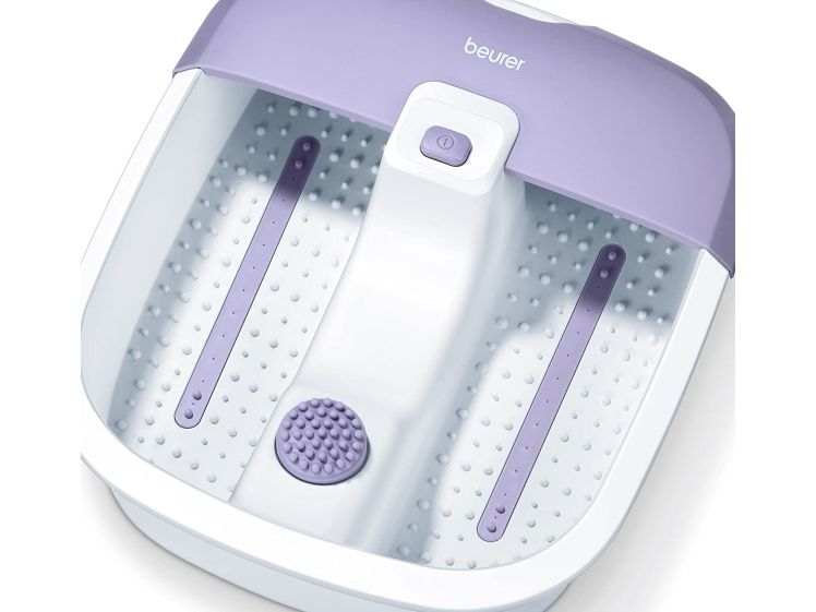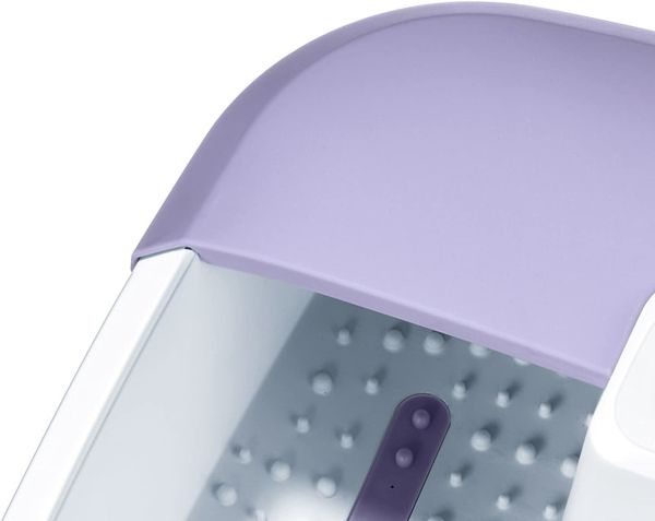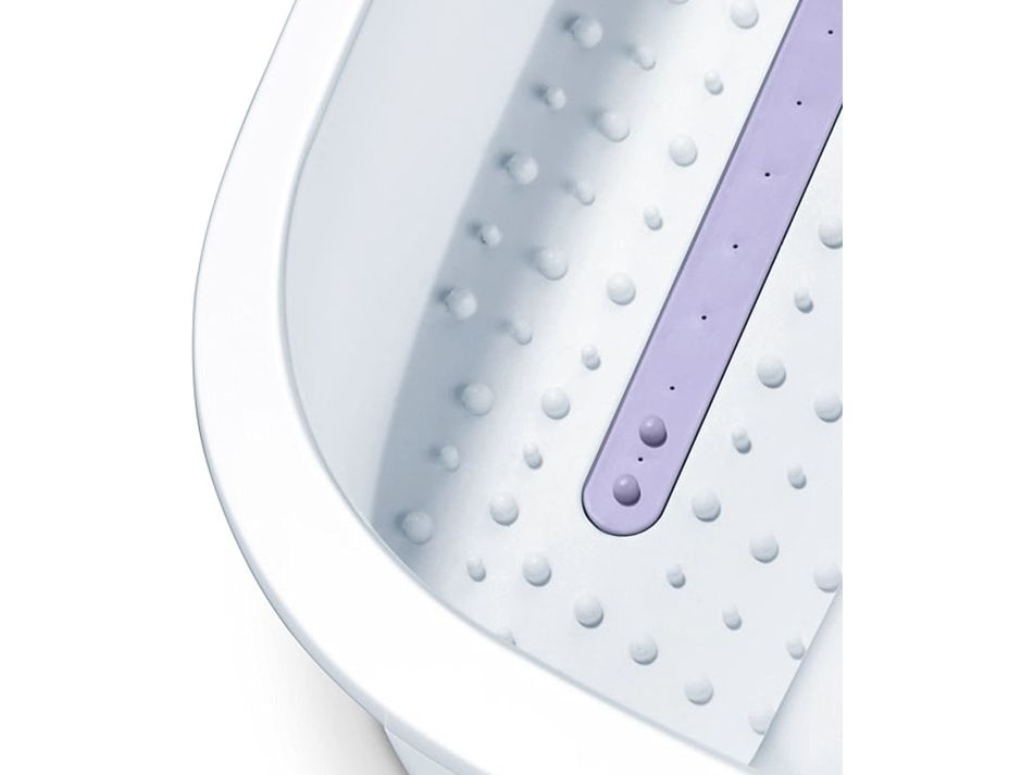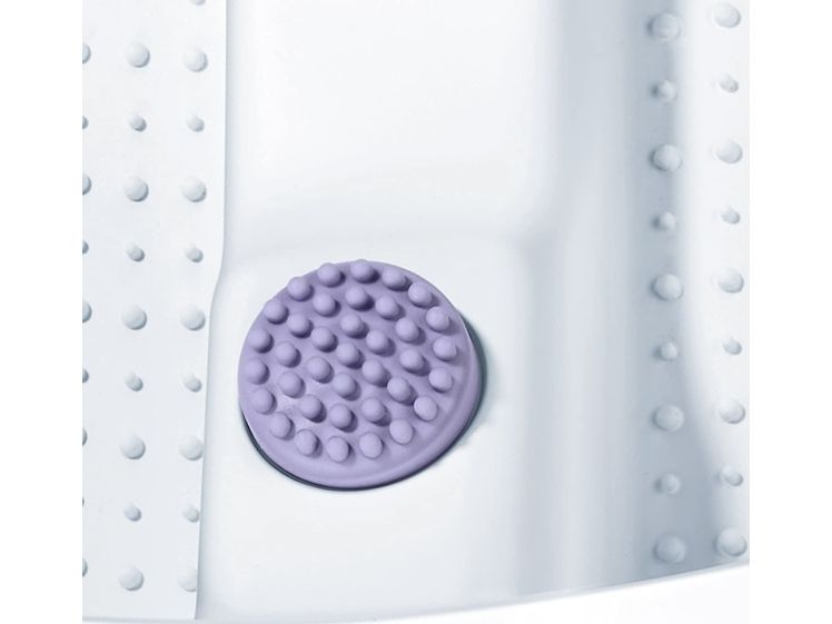 FB 12 Fodspa. Vibrationsmassage og boblemassage. Holder vandet varmt. Lille massagehoved medfølger. Fodstøtte beklædt med små massageknopper.