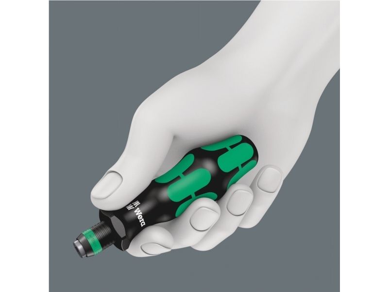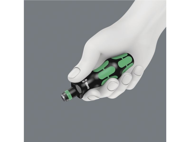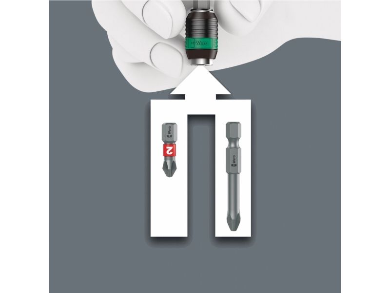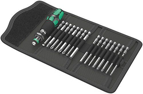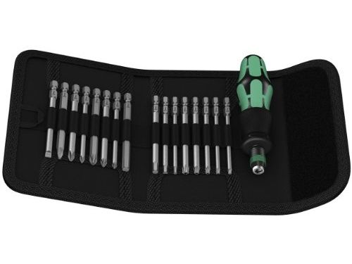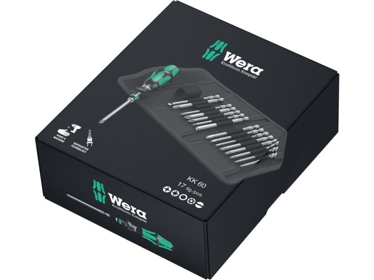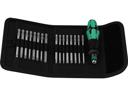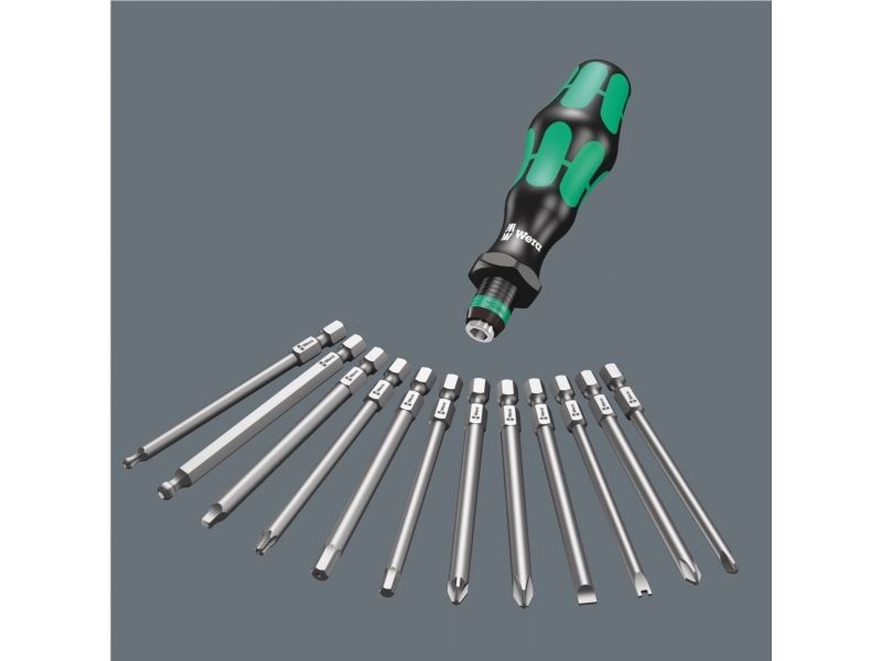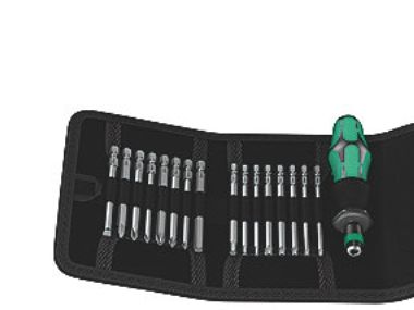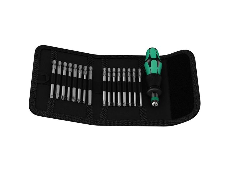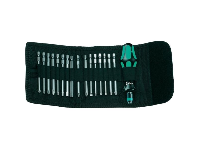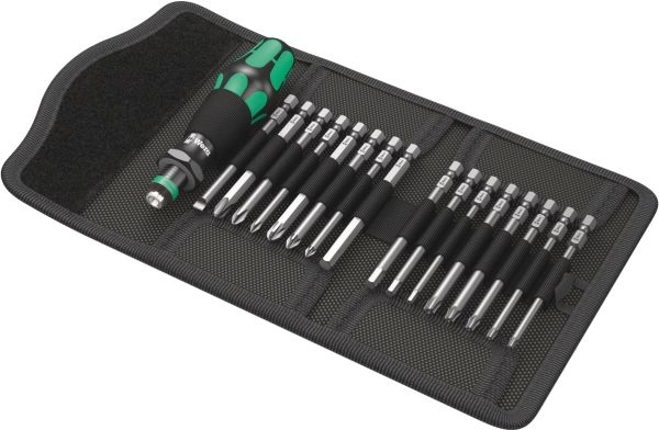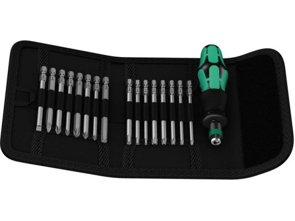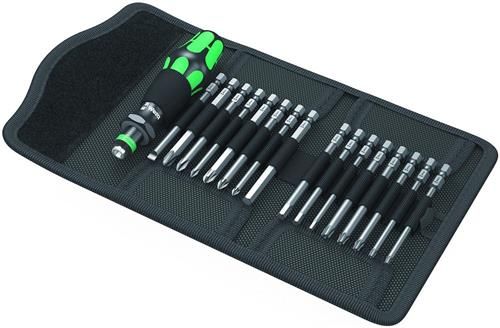 Foldetaske med 89 mm lange bits. Inklusiv håndgreb 816 R Kraftform med "Rapidaptor" hurtigskift og flerkomponent Kraftform-greb til mindre trættende arbejde. Hårde grebszoner til høj arbejdshastighed, mens bløde grebszoner sikrer stor momentoverførsel. Egnet til manuel og maskinskruning. 17 dele.