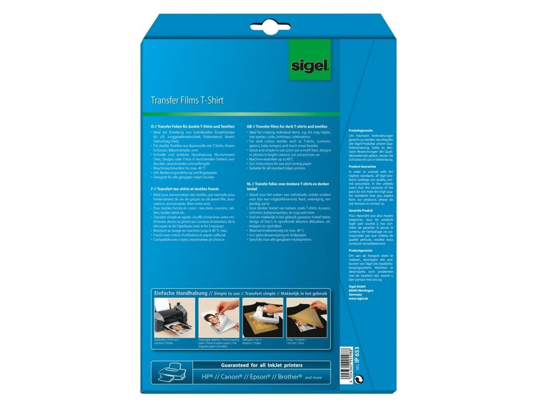 The transfer films for dark textiles are ideal for customizing cotton T-shirts, cushions, aprons and much more besides. The pack includes detailed instructions for use and washing instructions. Suitable for all standard inkjet printers. Box contents: 6 A4 films.