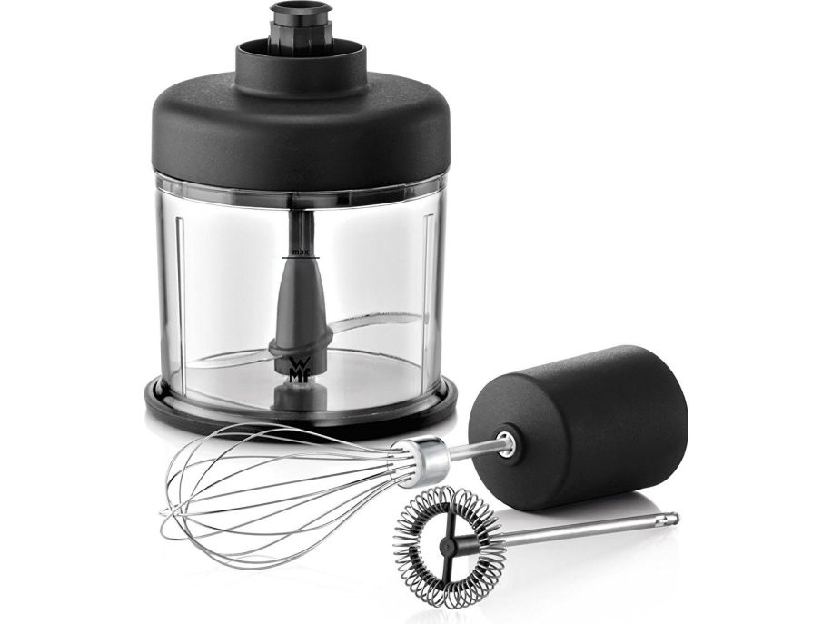 The accessory set fits all LINEO and LONO stainless steel stick blenders. It consists of a chopper (chopper container (0.6 litre) with non-slip base, high quality 2-wing stainless steel blade, removable blade unit), a whisk attachment and a milk frother attachment.
