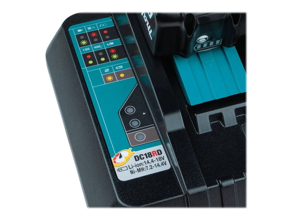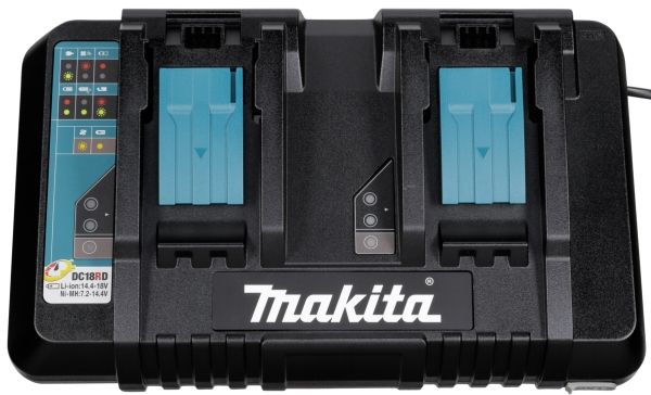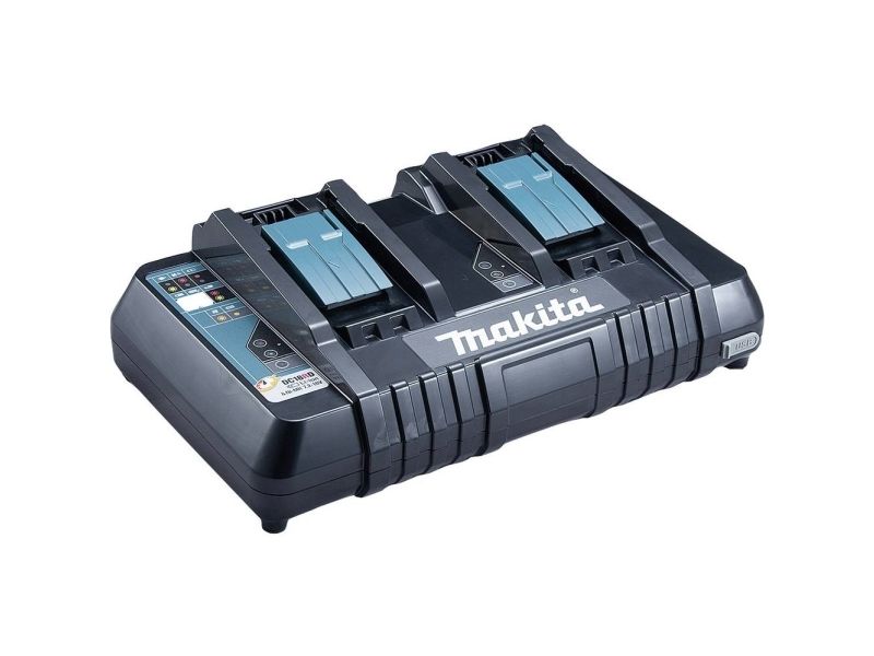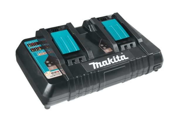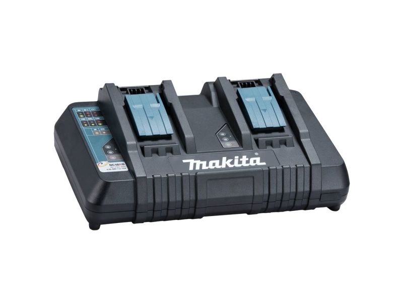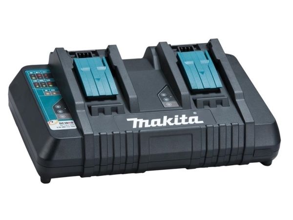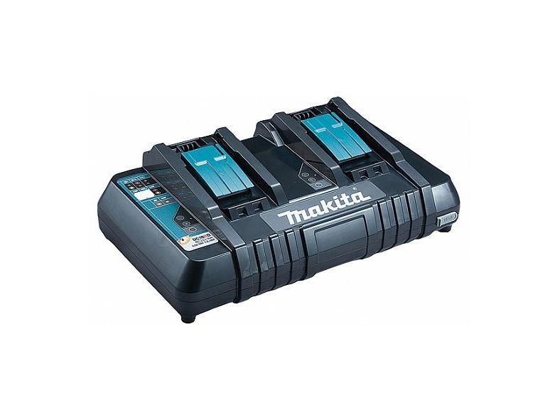 Dobbel hurtiglader til LXT 18V batterier som lader to batterier samtidig. Utstyrt med kjølevifte som holder battericellene på en gunstig temperatur for rask lading. Optimal lading overvåker også volt og strømmengde i ladeprosessen. Full lading på to 18V 3,0Ah batterir er 22 minutter, og på to 18V 5,0Ah batterier er det 45 minutter.