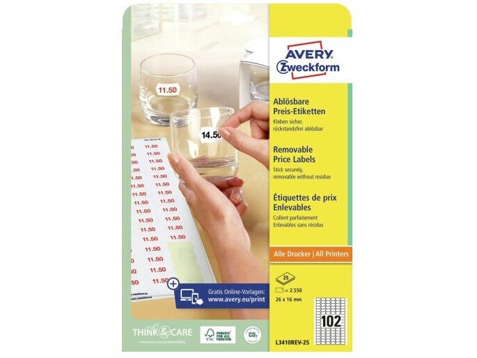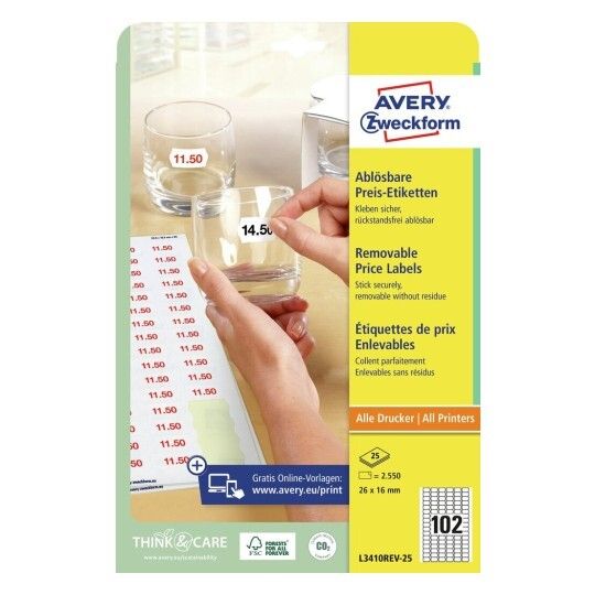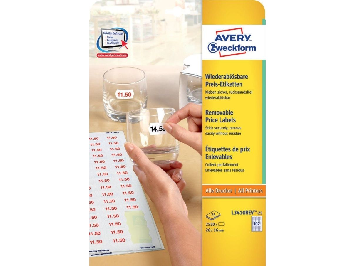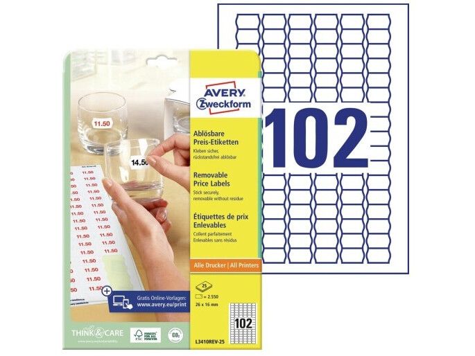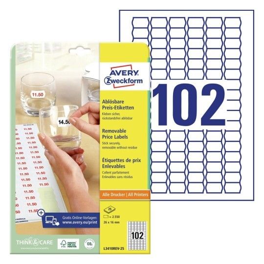 | • Print prisetiketter på din egen printer • Aftagelige, kan fjernes uden at efterlade limrester • Flytbare • FSC® certificerede • Design og print nemt med GRATIS skabeloner |