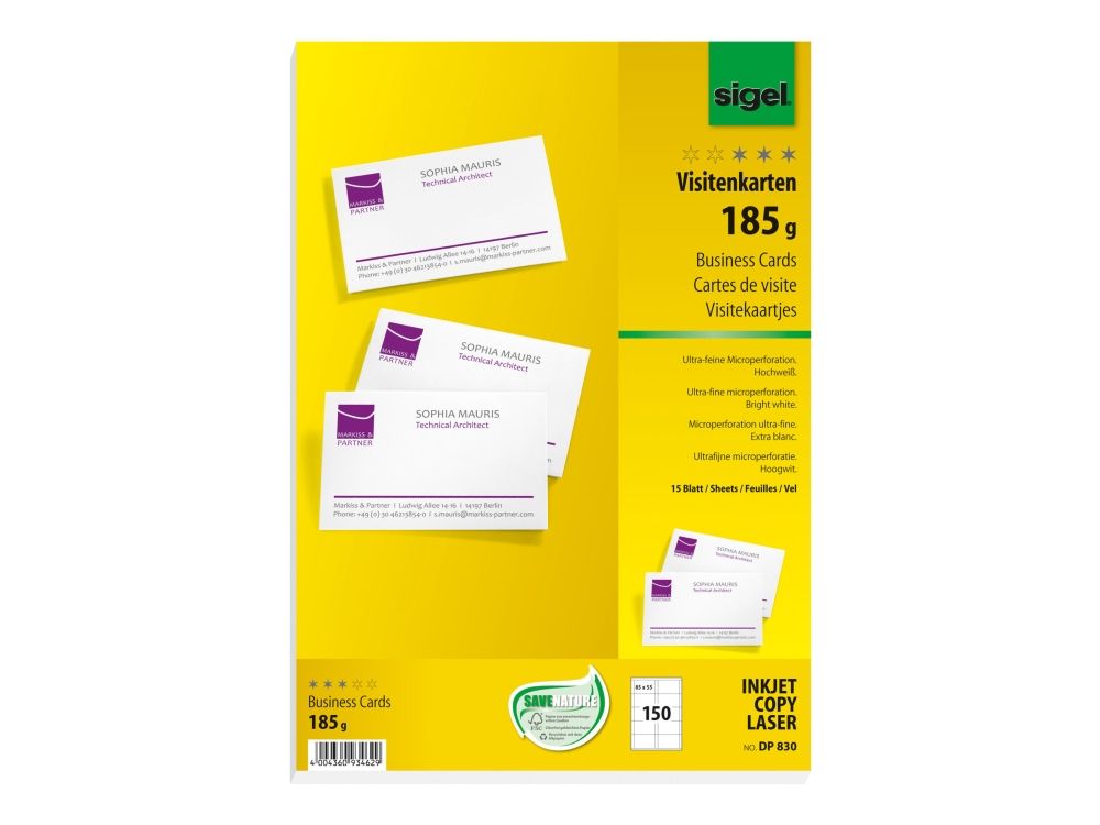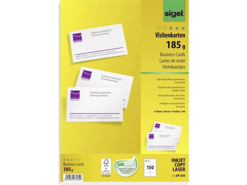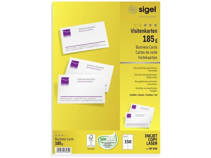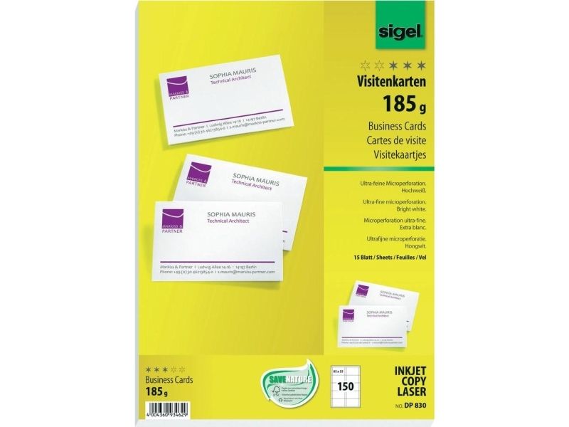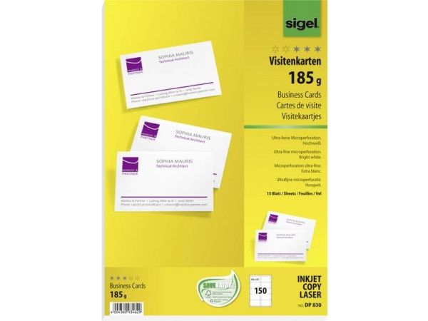 Sigel DP830 - Mikroperforert - sterkt hvitt - 85 x 55 mm - 185 g/m² - 150 kort (15 ark x 10 visittkort