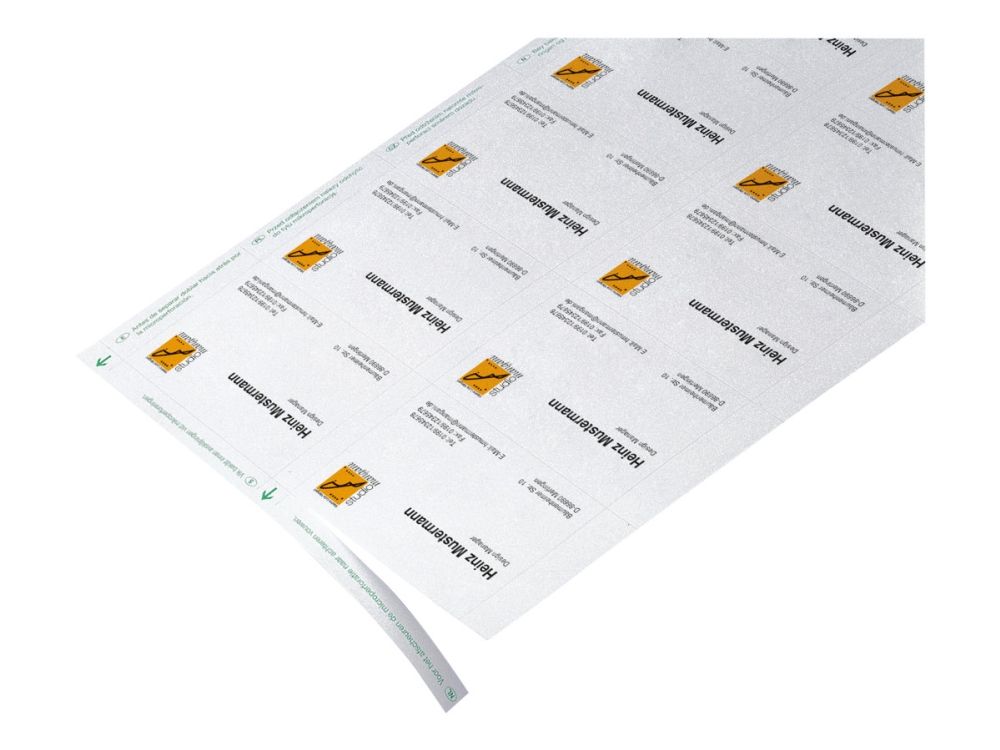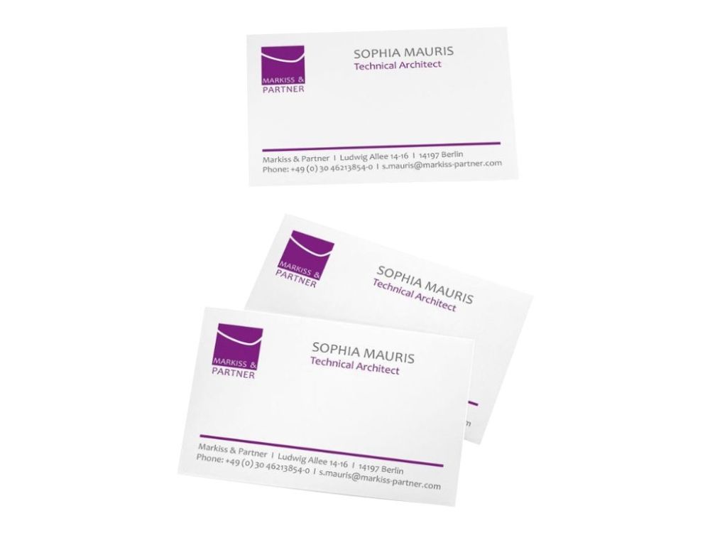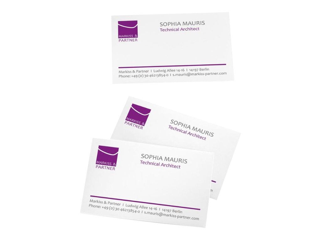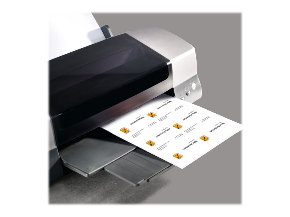 PC business cards, bright white, 185 gsm, FSC®-certified. The fast, simple way to design and print business cards with your own PC and printer. Ultra-fine microperforations make the cards simple to detach from the sheet and guarantee clean, precise edges. The business cards are extremely practical, e.g. for events, trade fairs or exchanging personal details, both in the professional and private sphere. Suitable for all inkjet and (colour) laser printers and copiers. The pack contains 15 A4 sheets for a total of 150 cards, 85x55 mm.