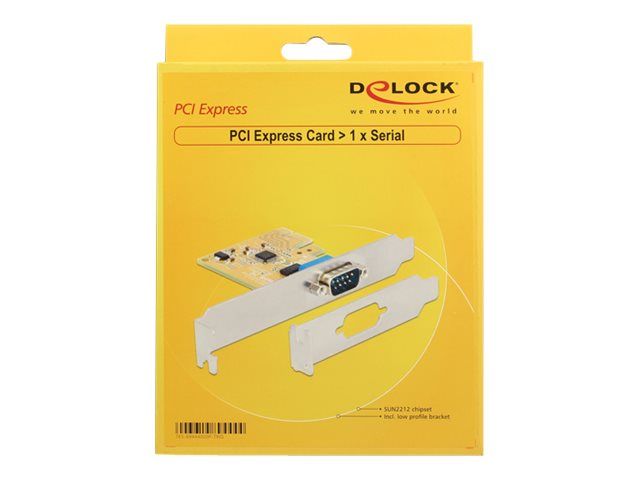 The DeLock PCI Express card expands your PC by one external Serial port. You can connect devices like scanner, modem, mouse etc. to the card.