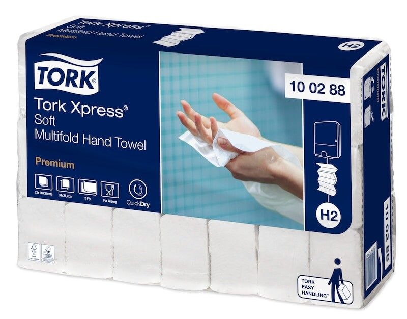 Giv gæsterne uovertruffen håndaftørring og komfort med de store, bløde Tork Xpress® Soft Premium Multifold Håndklædeark, som skåner hænderne og føles behagelige. Disse håndklædeark passer i Tork Xpress® Dispenser Multifold Håndklædeark til toiletter med middel brugerfrekvens. Den passer på steder, hvor pladsen er trang, og er bekvem og hygiejnisk for dine gæster.