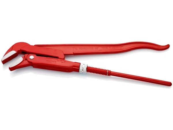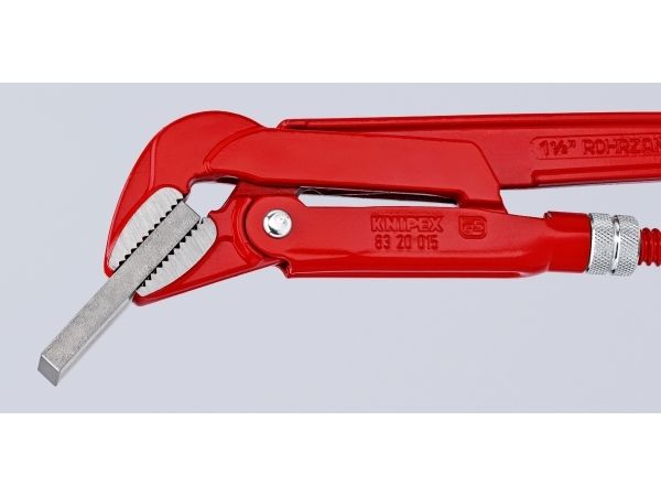 83 20 015 Hjørne-rørtang 45° Svensk form. 45° afbøjet gab. Fortanding, forskudt mod omdrejningsretningen. Fortanding yderligere induktivt hærdet. Dobbelt-T-profilgreb. Umistelig stillemøtrik. Rød pulvercoated, blankslebne kæber