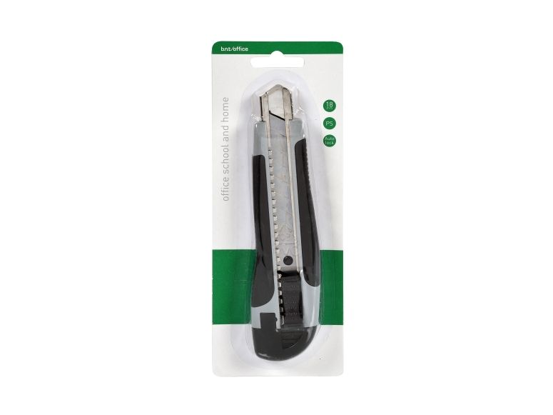 b.n.t / Office brytkniv med gummigrepp och stålförstärkning. 18mm blad, låsbar. Kasett för extra blad. 3 blad medföljer.