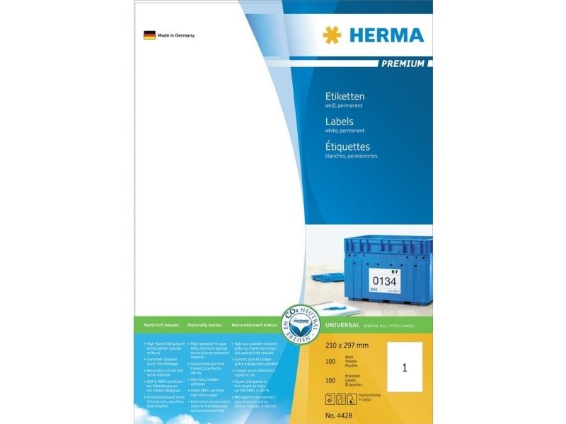 HERMA SuperPrint self-adhesive labels on A4 sheets are perfect for all PC printers (laser/inkjet/dot-matrix), copiers, multi-functional machines, also suitable for color laser printers / color copiers. High-grade special paper, chlorine-free bleached, solvent-free adhesive. The label paper in High-Resolution-Quality guarantees perfect toner fixing and optimum laser printing results, also at high resolution. Trouble-free processing due to all-around protective edge and optimum lay flatness.