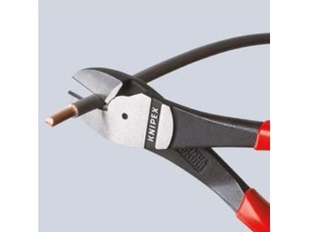 Til hårdeste, vedvarende belastning. Høj skæreydelse ved lavt kraftforbrug pga. optimal tilpasning af skærevinkel og udvekslingsforhold. Præcisionsskær yderligere induktionshærdet (skærets hårdhed ca. 64 HRC), til alle typer tråd, inklusive pianotråd. det 250 mm lange skævbider egner sig til Cu-ledere op til 16 mm² og Al-ledere op til 35 mm².