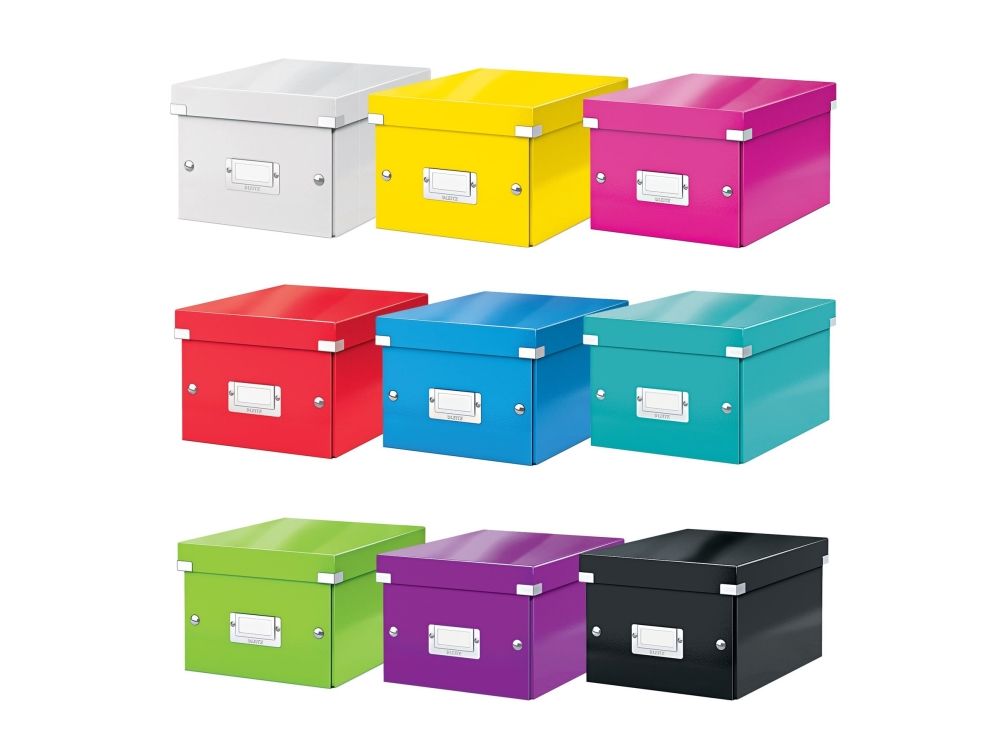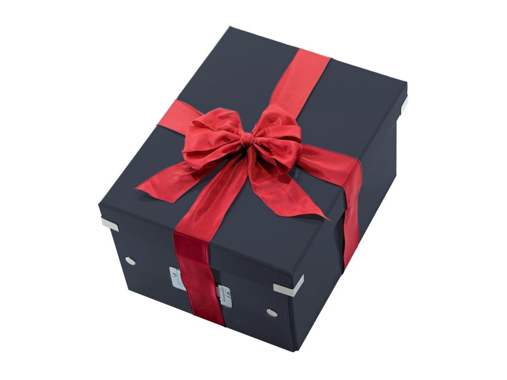 Universal small storage and transportation box for A5 documents with a laminated surface and metal corner elements for robust protection. Label holder simplifies indexing. Collapsible for space-saving storage when not in use. This contemporary design looks great in any office.