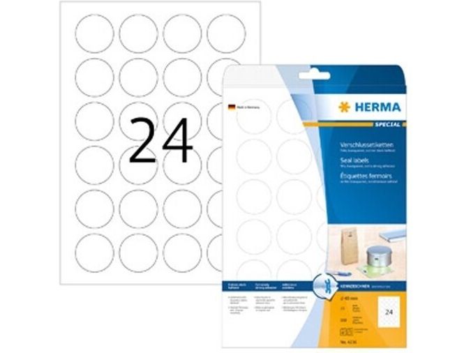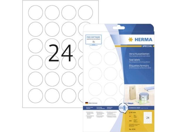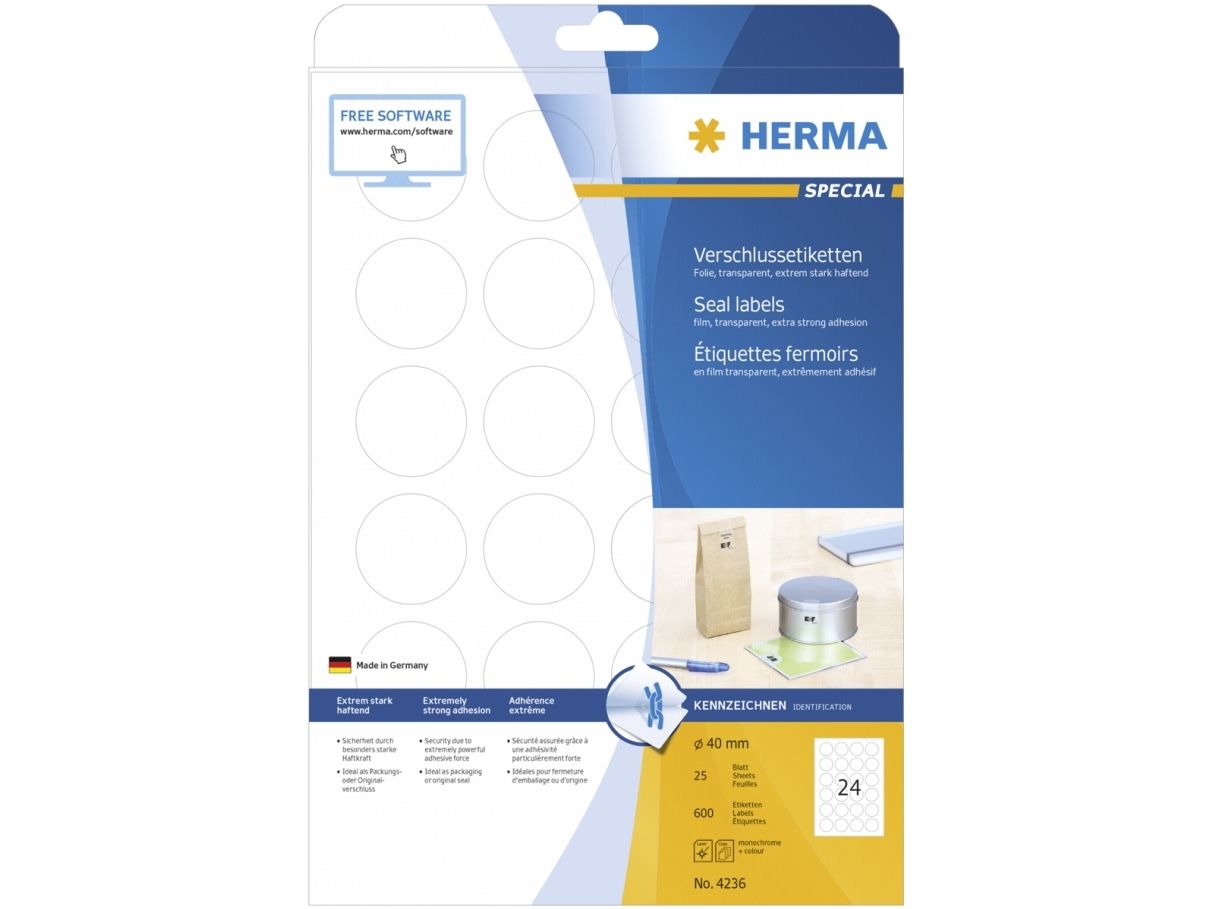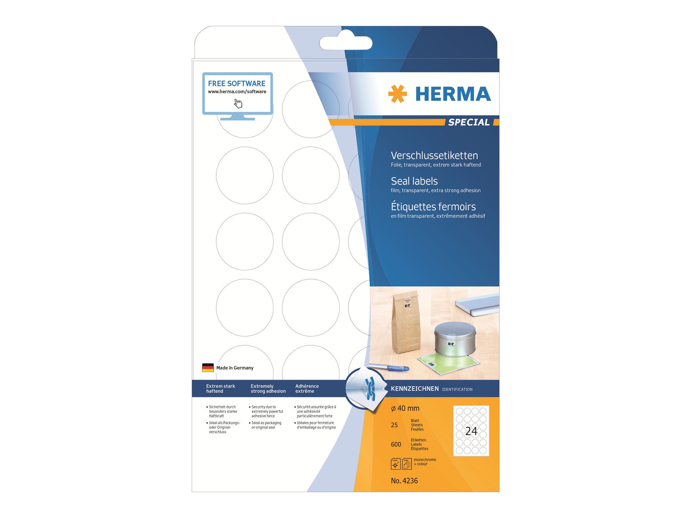 HERMA Special - Polyester - selv-adhesiv - gjennomsiktig - 40 mm rund 600 etikett(er) (25 ark x 24 sikkerhets/forseglings-etiketter