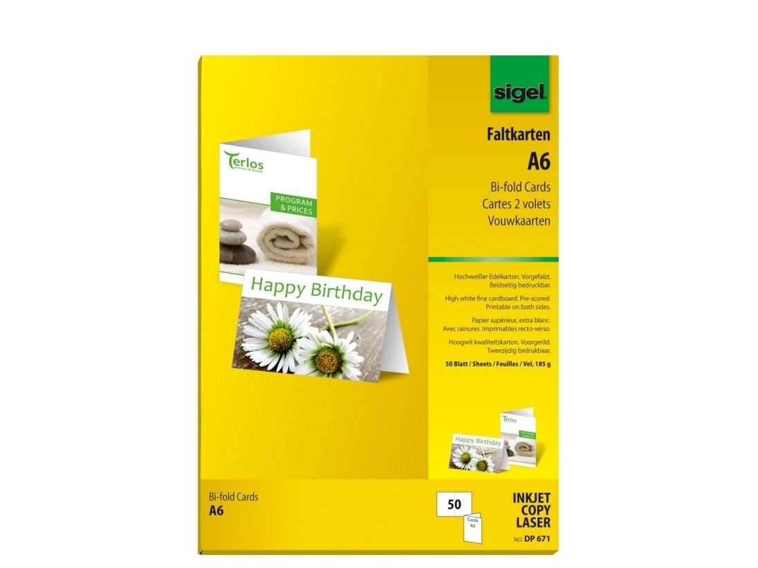 Pc-foldekort til selvdesign med pc og printer. Til kreative idéer, alsidigt anvendelige og altid perfekte. Kortene er forrillet, så der foldes knivskarpt til format A6, 185 g - til alle inkjet- og laserprintere samt kopimaskiner.