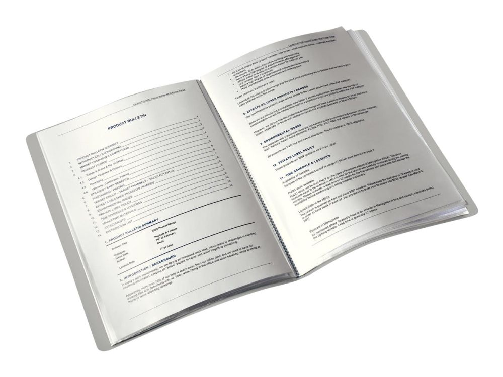 Distinctive, high quality PP display book with a soft brushed finish and in a sophisticated colour range: arctic white, garnet red, celadon green, titan blue and satin black. Ideal for presentations or organising documents.