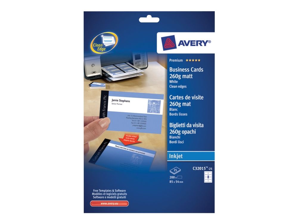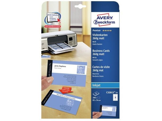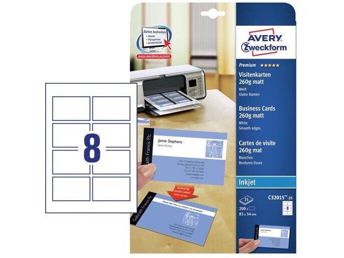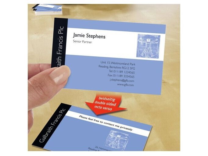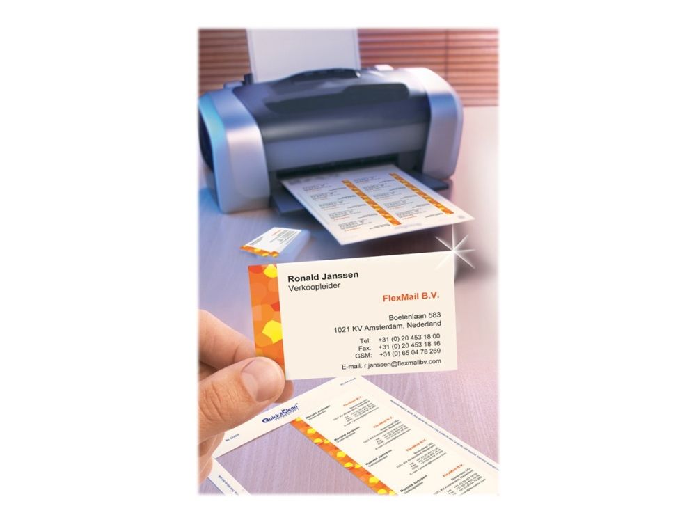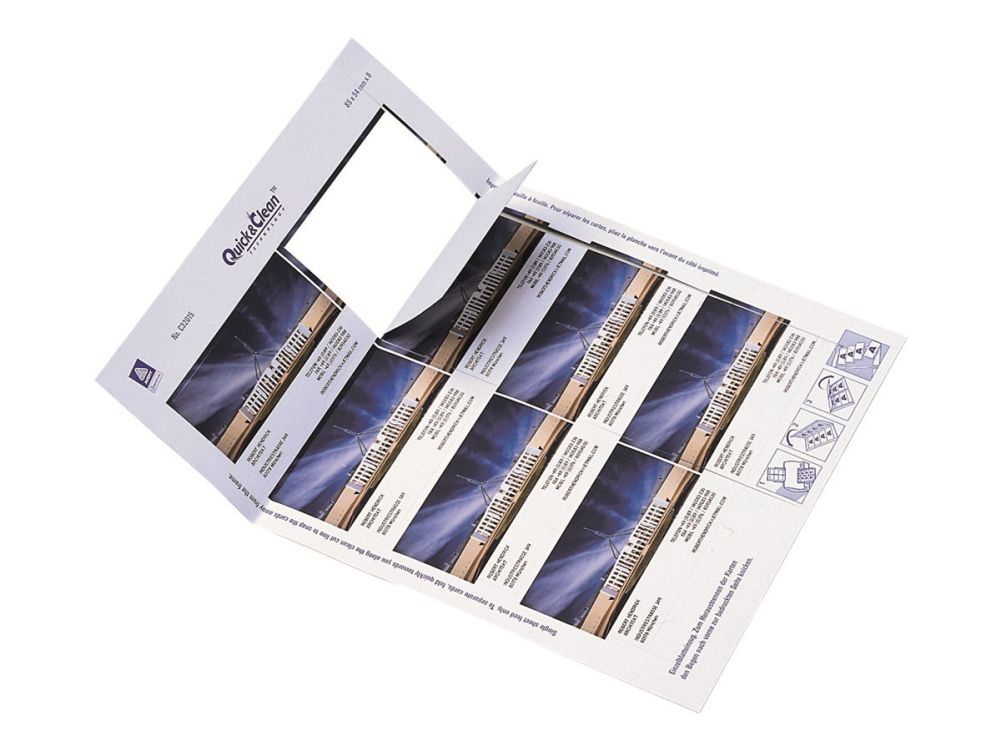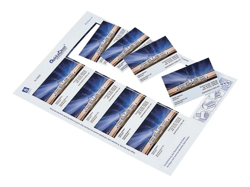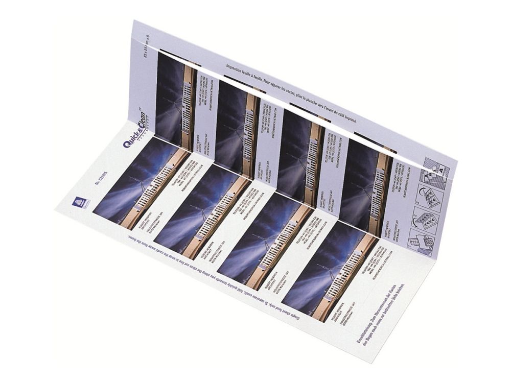 | • Quick&Clean™ sørger for visitkort med helt skarpe kanter • Kan også bruges som bordkort, gavemærkat, aftalekort mv. • Kan printes på begge sider • FSC® certificerede • Design og print nemt med GRATIS skabeloner |