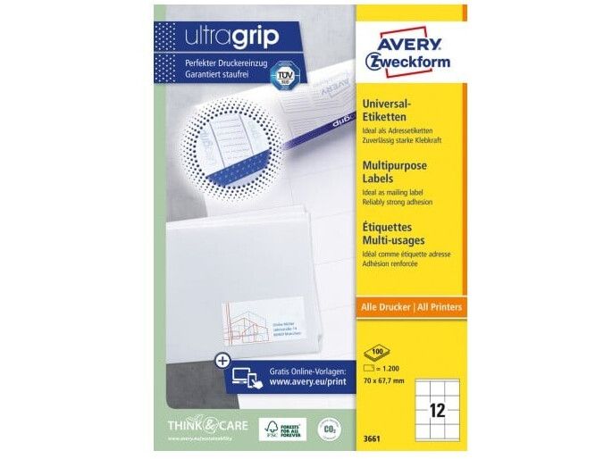 Har du flere forskellige typer printere på kontoret? Intet problem, du behøver kun købe én slags etiketter, for med Avery’s hvide 3661 Universaletiketter med Ultragrip til indendørsbrug med 12 etiketter/ark og 1200 etiketter/pk, får du etiketter der kan bruges til både s/h- og farvelaserprintere, inkjetprintere samt kopimaskiner. Så behøver du ikke længere bekymre dig om du har lagt etiketterne til Inkjetprinteren i Laserprinteren.