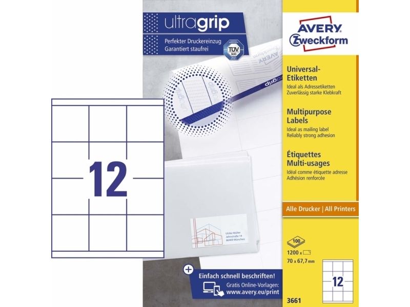 Avery - Hvit - 70 x 67.7 mm 1200 etikett(er) (100 ark x 12 flerbruks merkelapper