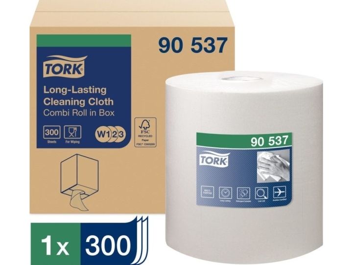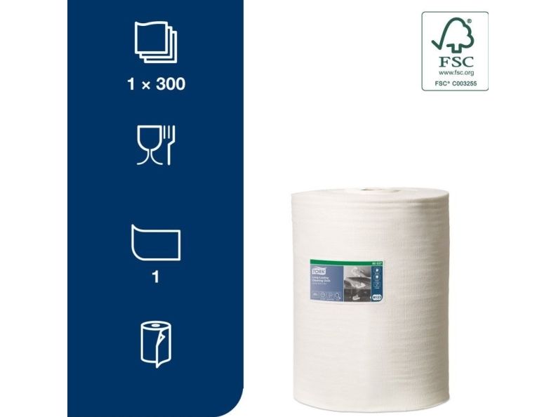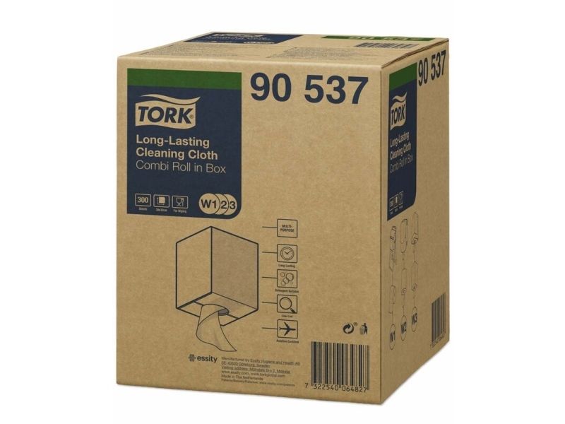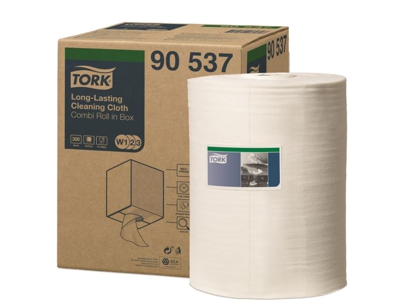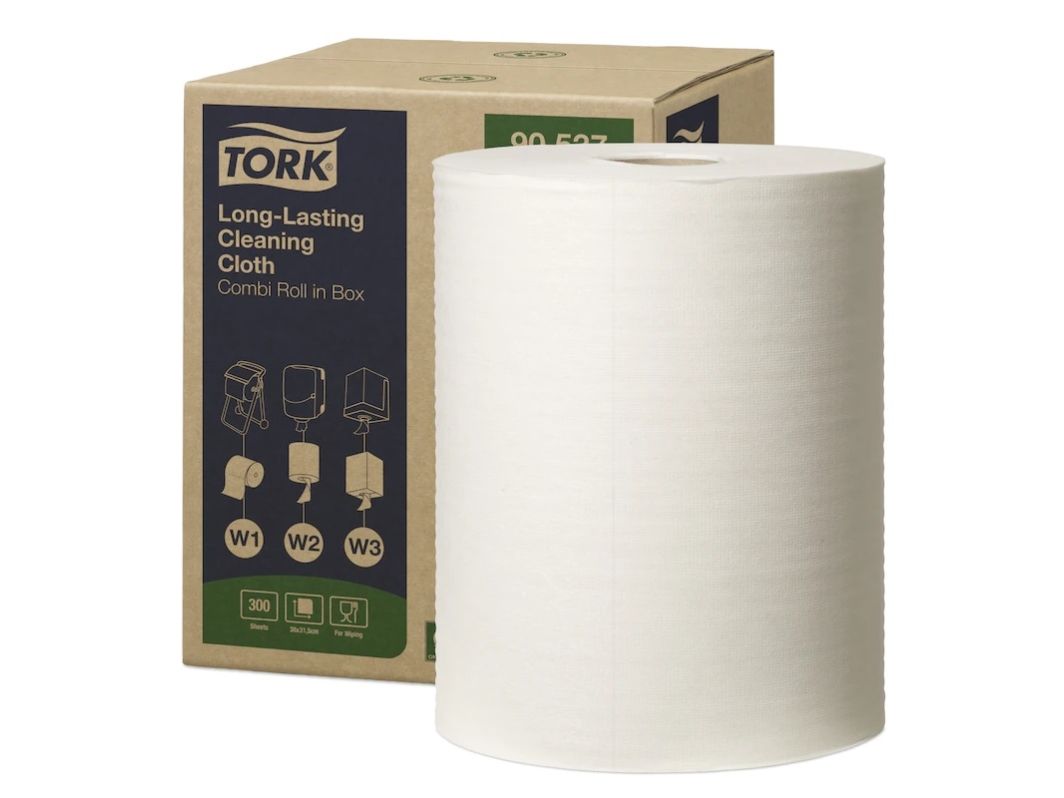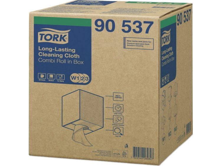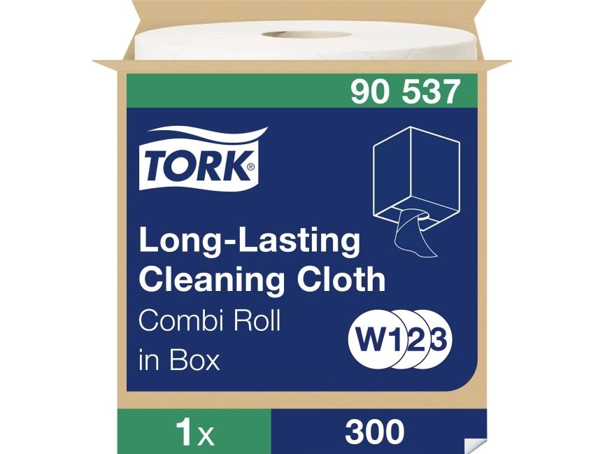Tork Alt-i-en klud er yderst absorberende og holdbar, så den kan bruges flere gange uden at gå i stykker. Denne klud kan bruges i Tork Top-Pak Dispenser, der beskytter refills mod snavs og har én-ad-gangen dispenserfunktion. Det er med til at reducere forbruget og dermed spild.