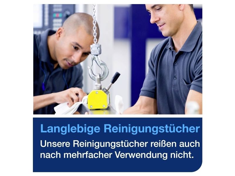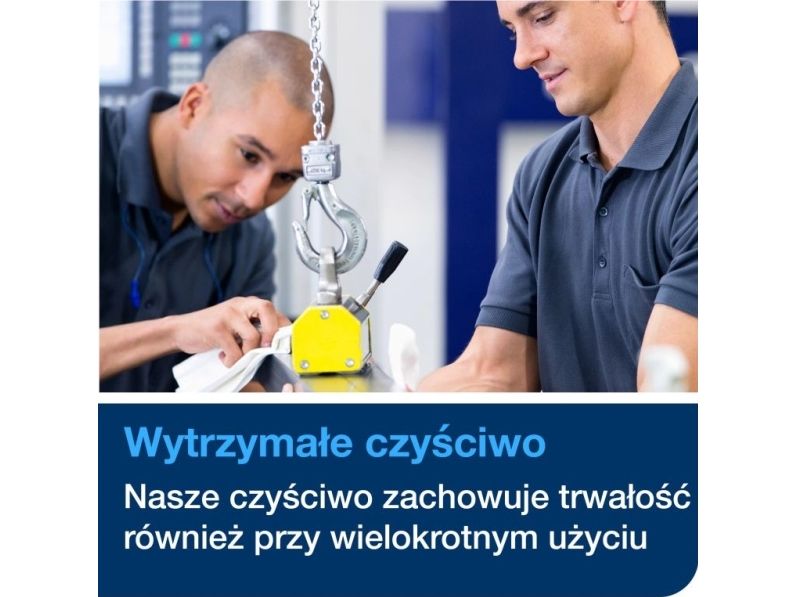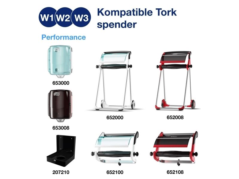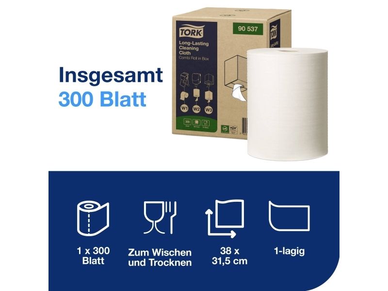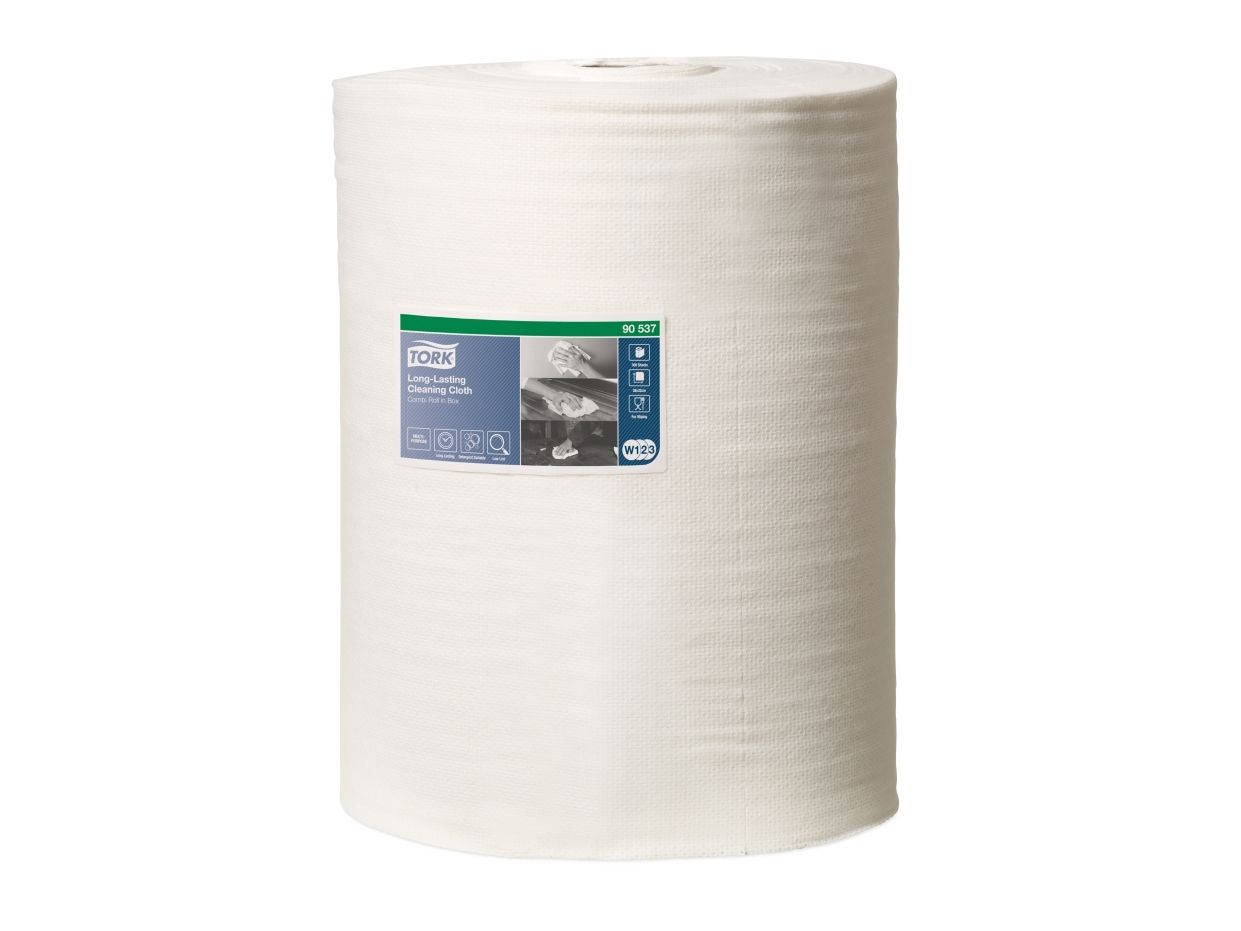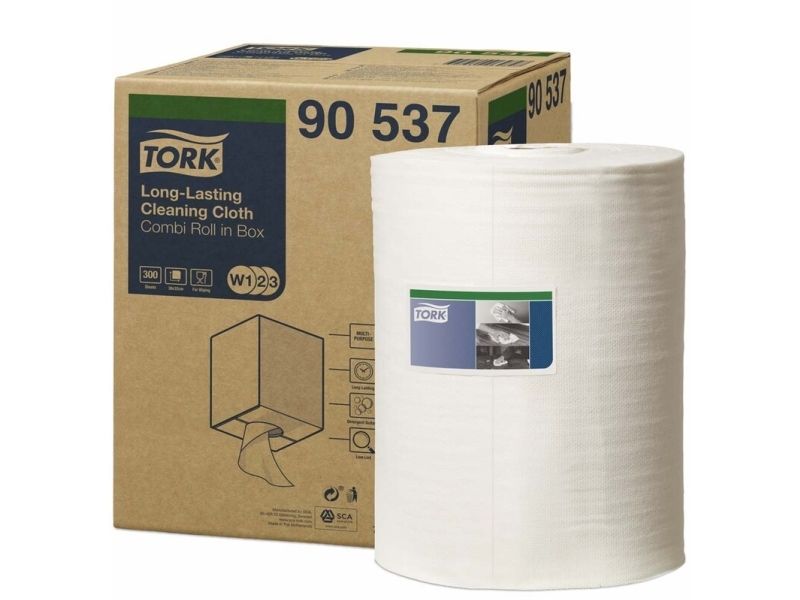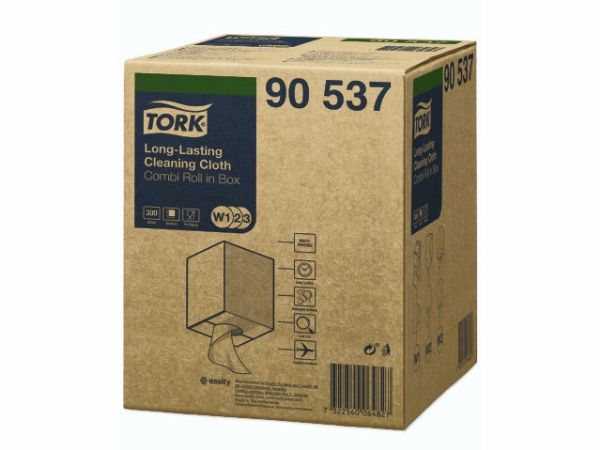 Tork Alt-i-en klud er yderst absorberende og holdbar, så den kan bruges flere gange uden at gå i stykker. Denne klud kan bruges i Tork Top-Pak Dispenser, der beskytter refills mod snavs og har én-ad-gangen dispenserfunktion. Det er med til at reducere forbruget og dermed spild.