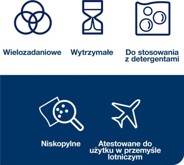 • Den kan anvendes med de fleste opløsningsmidler, desinficeringsmidler og rengøringsmidler og opfylder dermed alle dine rengøringsbehov • En allround klud, som er praktisk til mange forskellige opgaver, så du kun behøver én klud • Kludens effektivt fnugbegrænsende egenskaber gør den perfekt til brug på sarte overflader