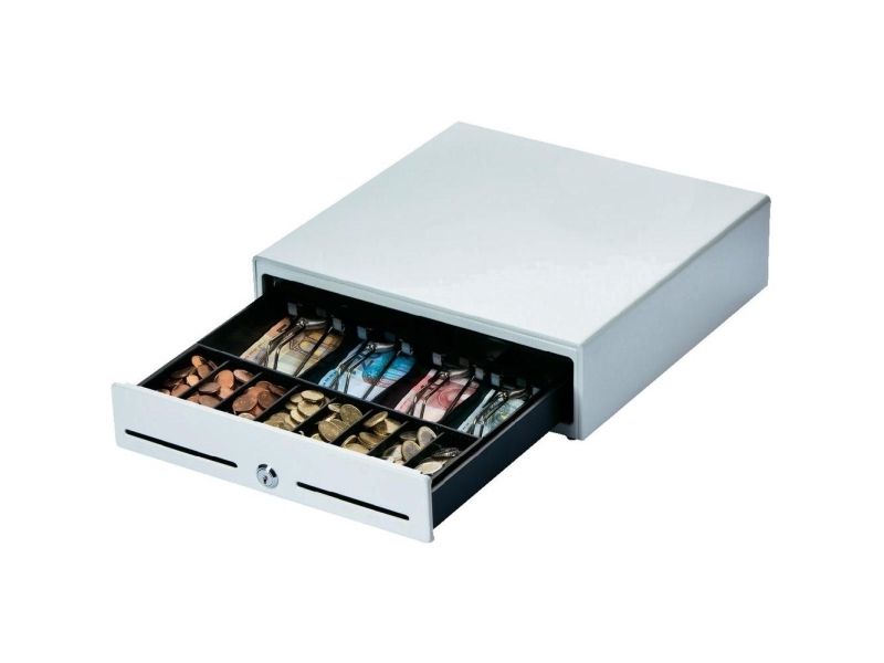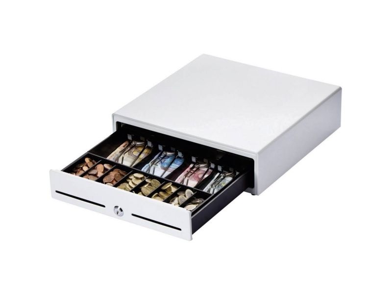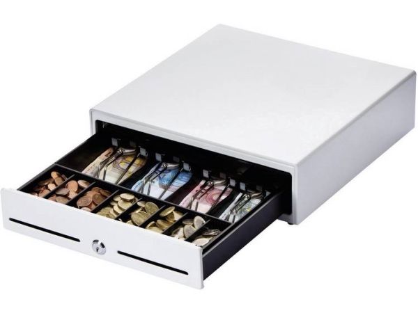 Mini-kasseskuffe K-2 Standardtilslutning til kasseprinter 24V Ideel til kasseområder med beskedent pladsbehov. Med kun 330 x 330 x 101 mm er den diskret og lille ved enhver kasselinje. De fire skrå seddelfag er optimeret til euro, men kan også rumme et stort antal andre valutaer uden problemer. De otte møntrum kan opdeles fleksibelt og kan således nemt tilpasses ethvert behov. Kasseskuffe i miniformat 8 møntrum, 4 seddelrum, 1 checkrum