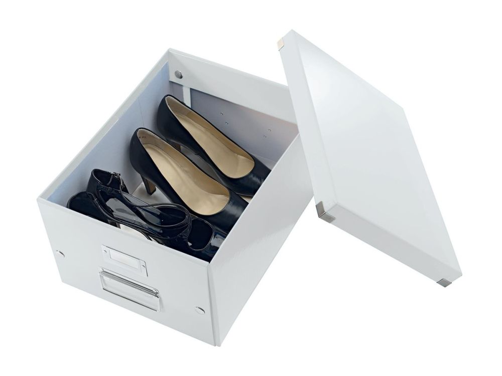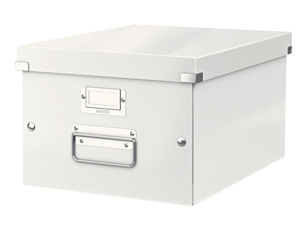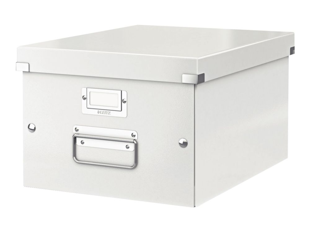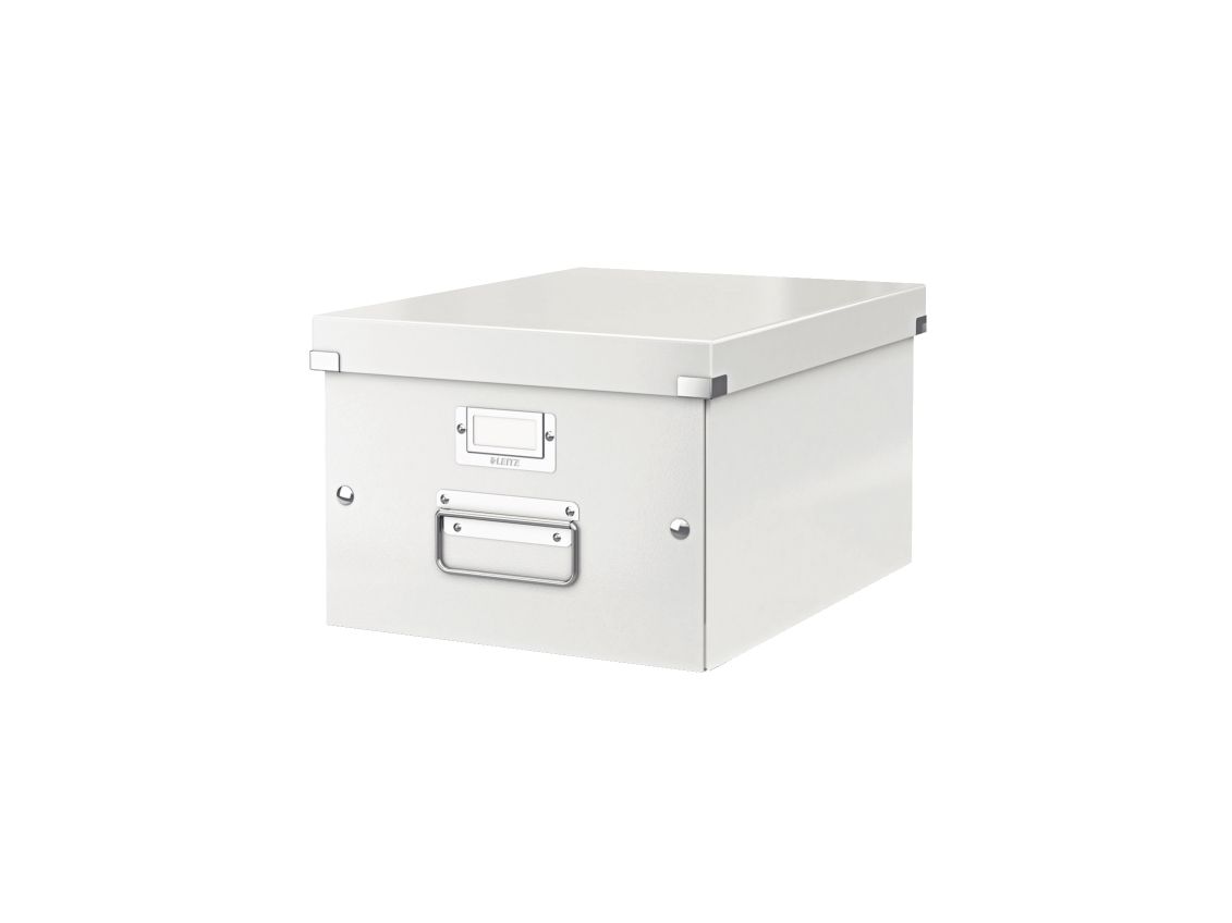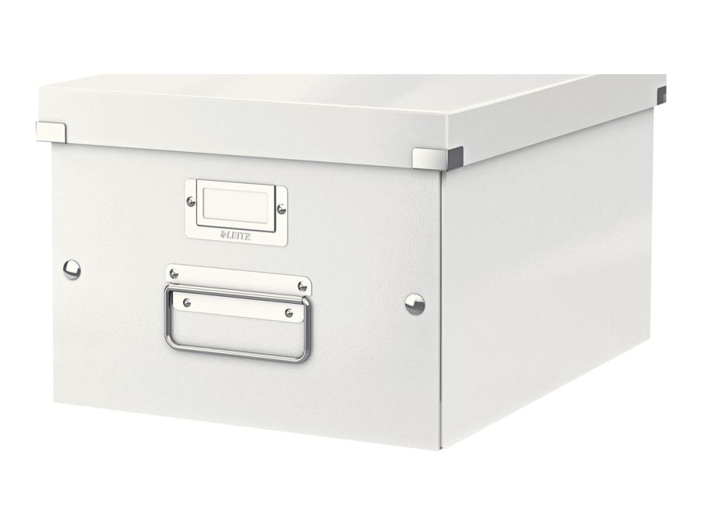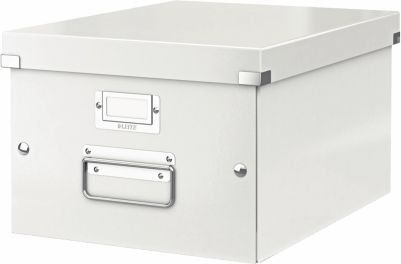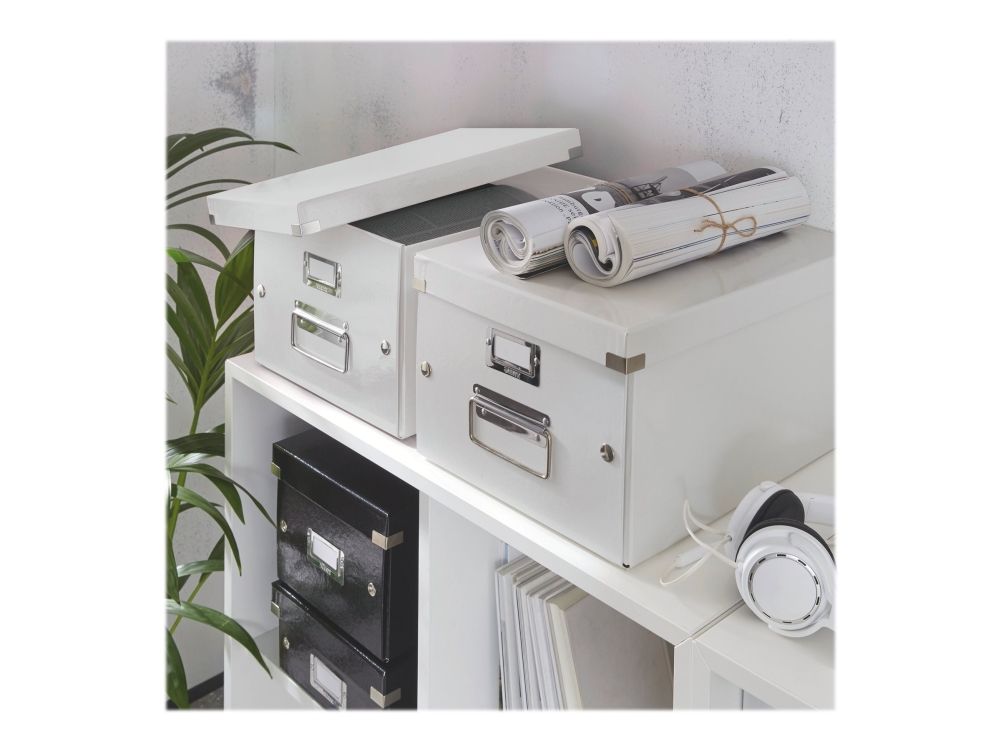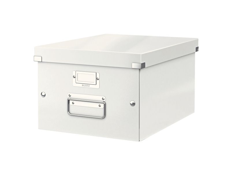 Universal medium storage and transportation box for A4 documents with a laminated surface and metal corner elements for robust protection. Sturdy metal handles make for easy transportation and a label holder simplifies indexing. Collapsible for space-saving storage when not in use. This contemporary design looks great in any office.