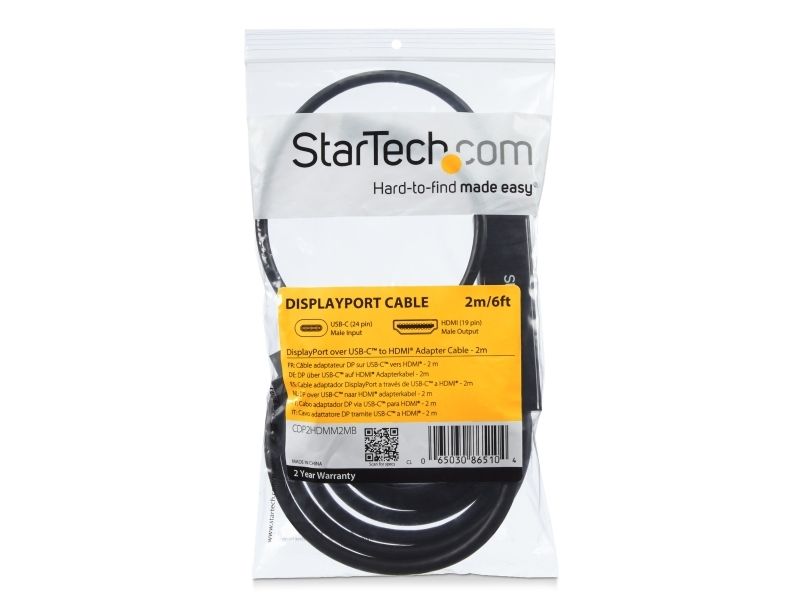 Denna USB-C till HDMI-kabeladapter är en praktisk lösning för att direkt ansluta din DisplayPort över USB Type-C-enhet till din HDMI-skärm, -TV eller -projektor. Adaptern stöder ett anslutningsavstånd på upp till 2 m och fungerar med USB-C-enheter med stöd för DP alt-läge, som till exempel MacBook, ChromeBook Pixel och Dell XPS-modeller 15 och 13. Den är dessutom kompatibel med Thunderbolt 3-portar. Trasselfri installation Med en längd på 2 m ger denna kabeladapter en direkt anslutning som eliminerar överflödiga adaptrar och kablar för att garantera en städad och professionell installation. För kortare installationer har vi dessutom en 1 m USB-C till HDMI-kabel, så att du kan välja rätt kabellängd för dina behov. Problemfri anslutning med USB Type-C Kabeladaptern är enkel att ansluta genom den mångsidiga och behändiga USB Type-C-porten på din enhet. USB-C är en vändbar kontakt så det spelar ingen roll hur du kopplar in den, adaptern kommer alltid att ansluta. Det besparar dig frustrationen av att försöka koppla in den korrekt när du dockar din dator till din arbetsstation eller hot desk på kontoret. Enastående bildkvalitet Du kommer att förundras över bildkvaliteten från en 4K-skärm eller -TV med fyra gånger högre upplösning än 1080p. Med denna kabeladapter kan du utnyttja videofunktionerna som är inbyggda i din USB Type-C-anslutning för att ge enastående Ultra HD-kvalitet till din 4K-skärm. Adaptern är bakåtkompatibel med 1080p-skärmar för att garantera att adaptern även fungerar med HD-applikationer i hemmet eller på kontoret. CDP2HDMM2MB täcks av StarTech.coms 3-årsgaranti och gratis livstidsgaranti på teknisk support. Obs.: Din USB-C-utrustade enhet måste ha stöd för video (DP Alt Mode) för att fungera med denna adapter.
