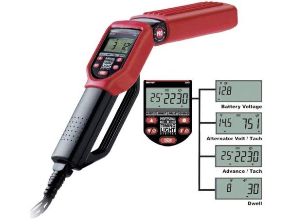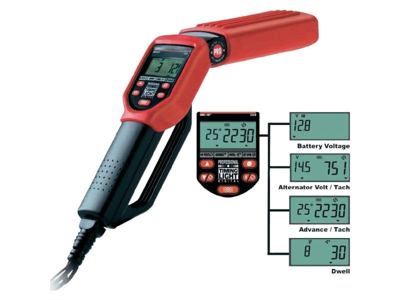 Pistol til tændingstidspunkt med testenhed DIS Måling af lukke- og tændvinkel, tændingstidspunkt og omdrejningstal · Gummibelagt overflade. Pistolen til tændingstidspunktet med testenhed DIS bruges til at teste batteriets ladespænding og tændingstidspunktet og til at bestemme en motors lukke- og tændingsvinkel. Spændingsforsyning udelukkende over køretøjets batteri. 4 driftstyper Inkl. opbevaringskuffert Til 2- og 4-takts-motorer