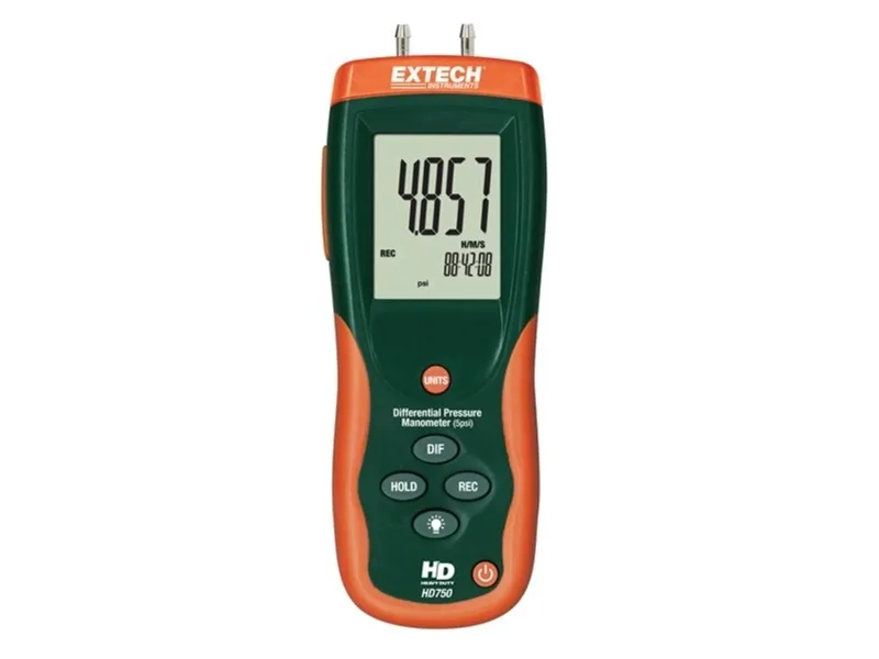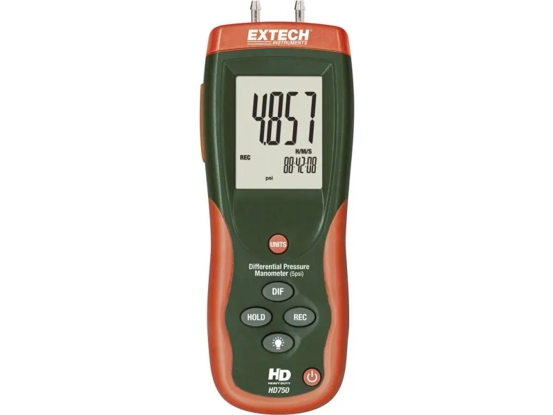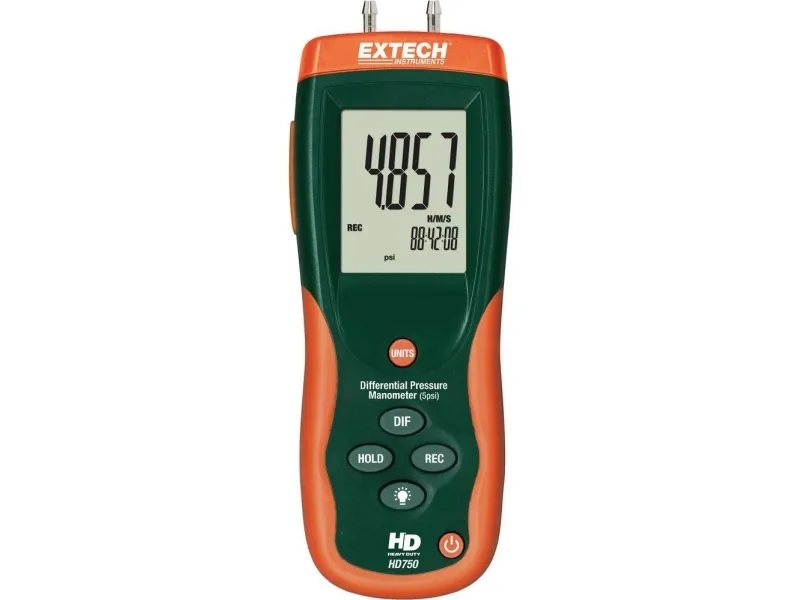 Differenstrykmåler HD-750 Maks./min.-registrering · Data Hold · Slukker automatisk · Zero-funktion · Displaybelysning · USB-interface · Målestørrelser: bar, psi, inH2O, mbar, kPa, inHG, mmHG, ozin², ftH2O, cmH2O, kgcm². Differenstrykmåleren i HD-750-serien overbeviser med sit lave trykområde og den høje opløsning. Takket være den påsprøjtede beskyttelse af blødgummi er apparaterne ekstremt robuste. Måleværdierne kan aflæses i 11 valgbare trykenheder. Med USB-interfacet og den medfølgende software kan måleværdierne overføres til en computer til viderebehandling. Maks./min.-registrering USB-interface