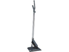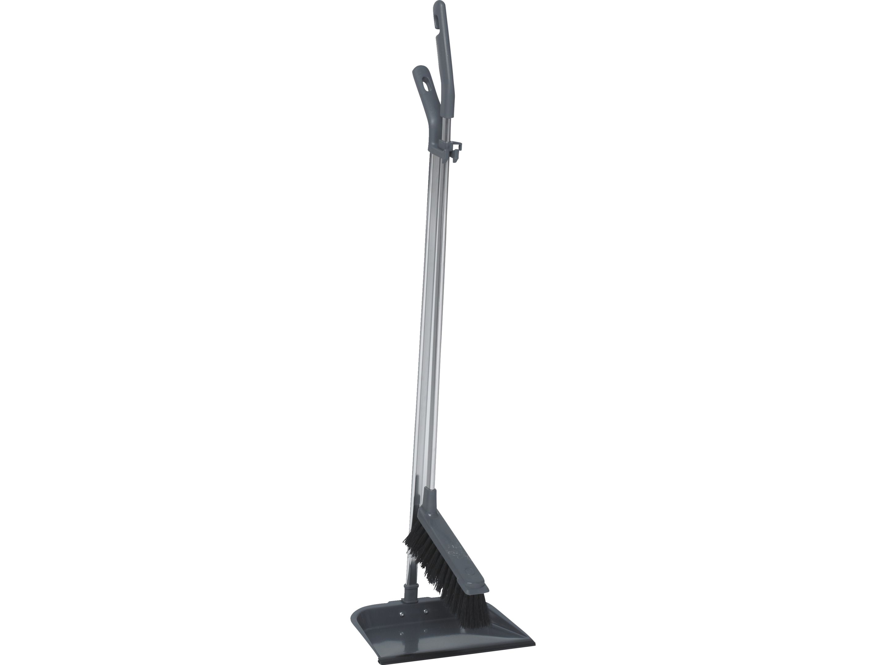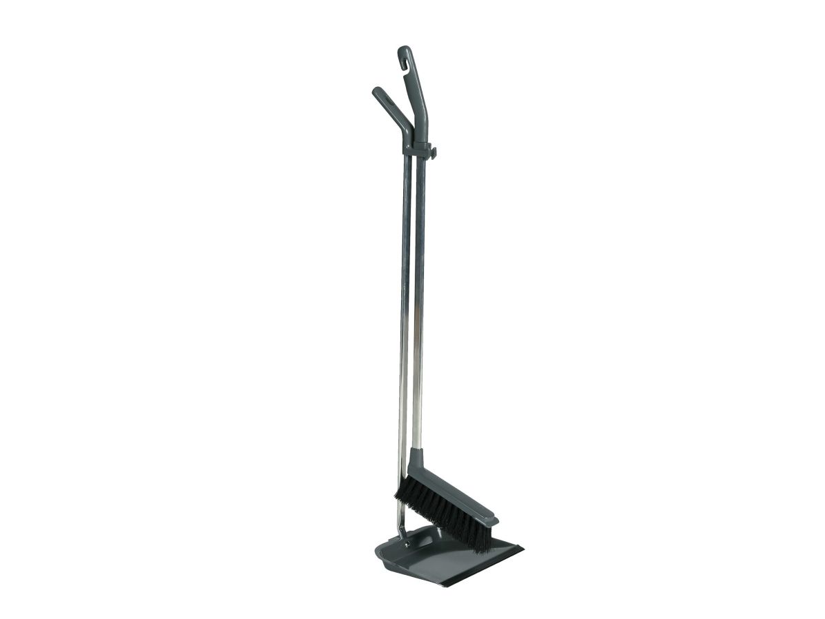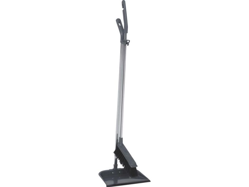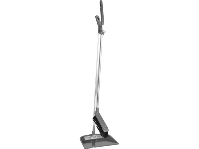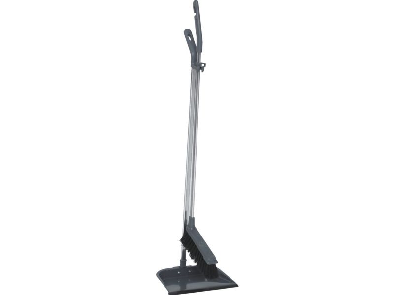 Sæt med kost og fejebakke, langt skaft, metal, grå.