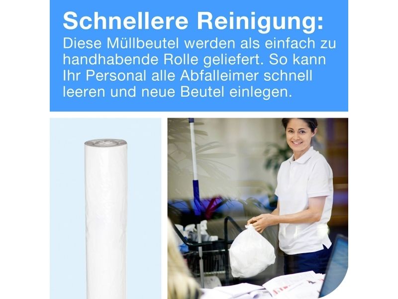 • Spar rengøringstid – disse affaldsposer fås i en praktisk rulle, der gør det hurtigt for personalet at tømme affaldsspande og sætte nye poser i.