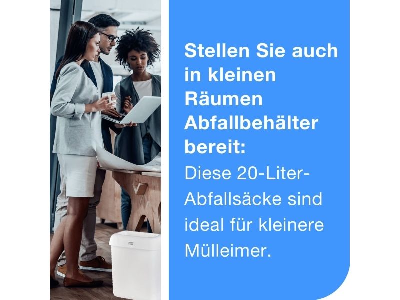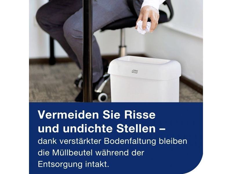 Med vores Tork 20 L Affaldspose Hvid kan du sikre, at der er affaldsspande på steder med begrænset plads og maksimere hygiejnen. Personalet kan hurtigt tømme affaldsspande og sætte en ny pose i med vores praktiske ruller, der er med til at lette vedligeholdelses- og rengøringsrutinerne. Kileforseglingen reducerer også risikoen for rifter og spild under håndtering af affaldet. Du træffer også et bæredygtigt valg med en affaldspose, der er lavet at 33% genanvendte materialer.