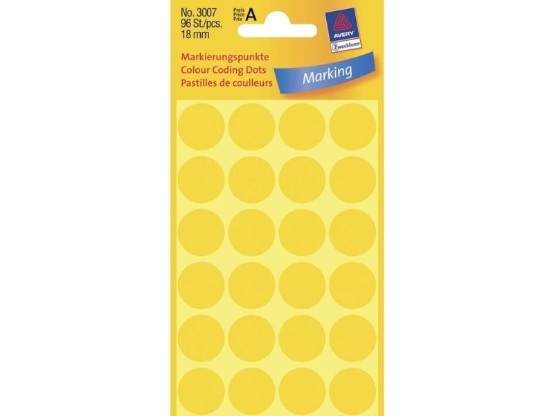 | • Fås i mange forskellige størrelser og farver • Til alle former for farvekodning • Permanent klæbende runde farvemarkeringsdots • Nemme at bruge |
