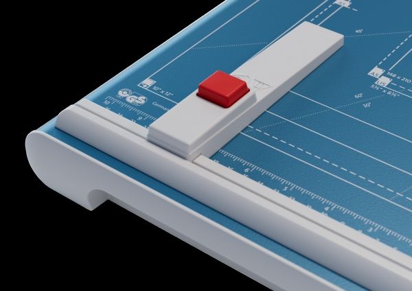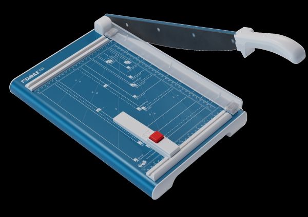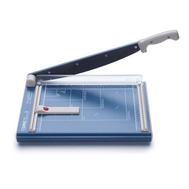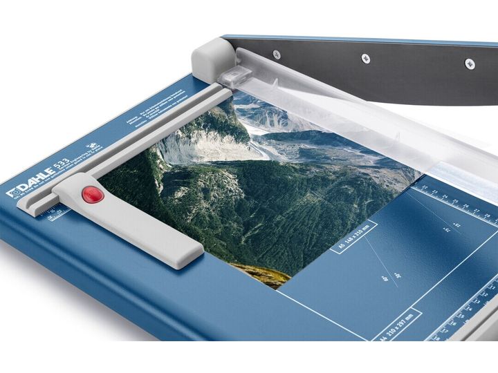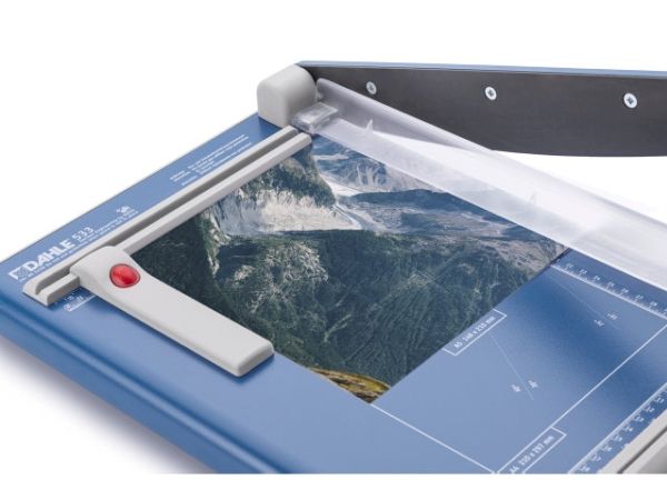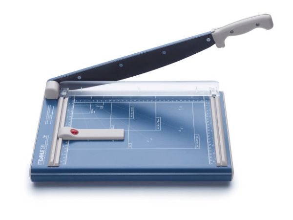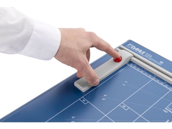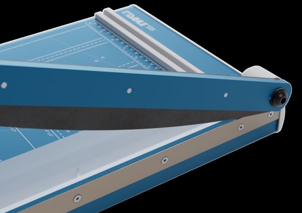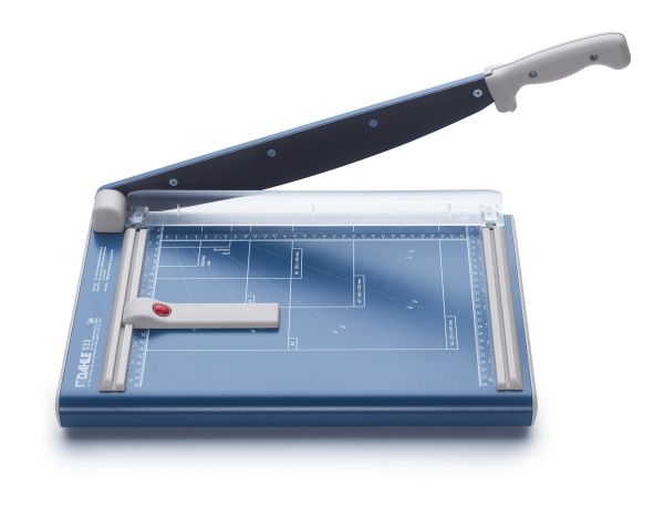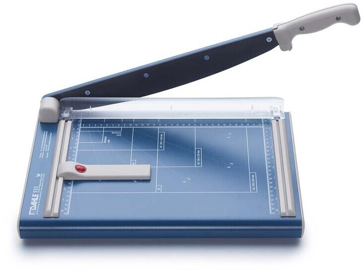 Skæremaskine med arm 533 Skæremaskine med arm og stabilt metalbord. Fastskruet planslebet øvre kniv og slebet nedre kniv af Solinger knivstål, håndpresse med integreret fingerbeskyttelse, 2 vinkelanlæg og indstillelig bagside. God bærekomfort med grebsfordybninger. God bærekomfort med grebsfordybninger