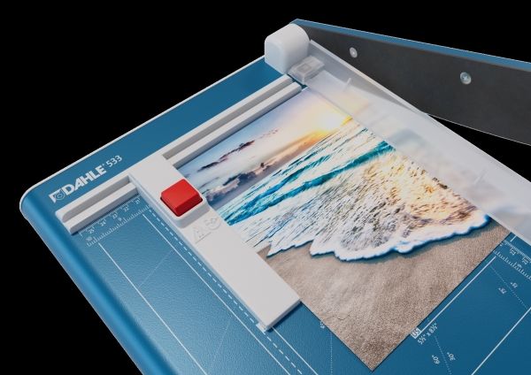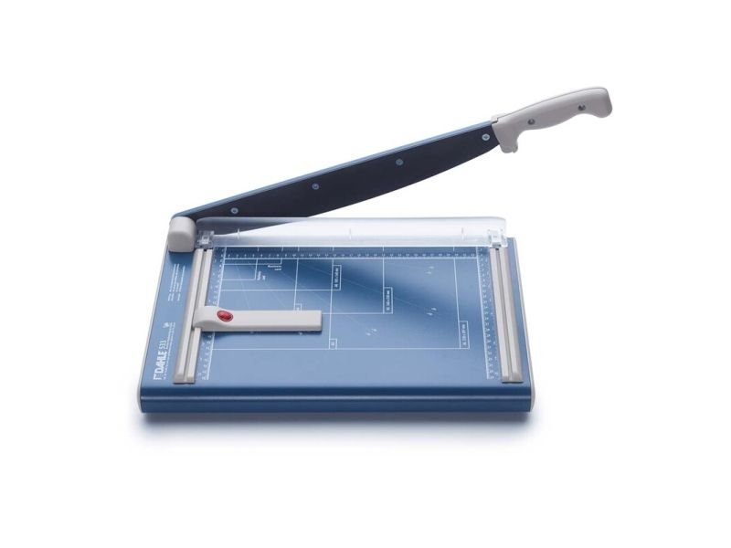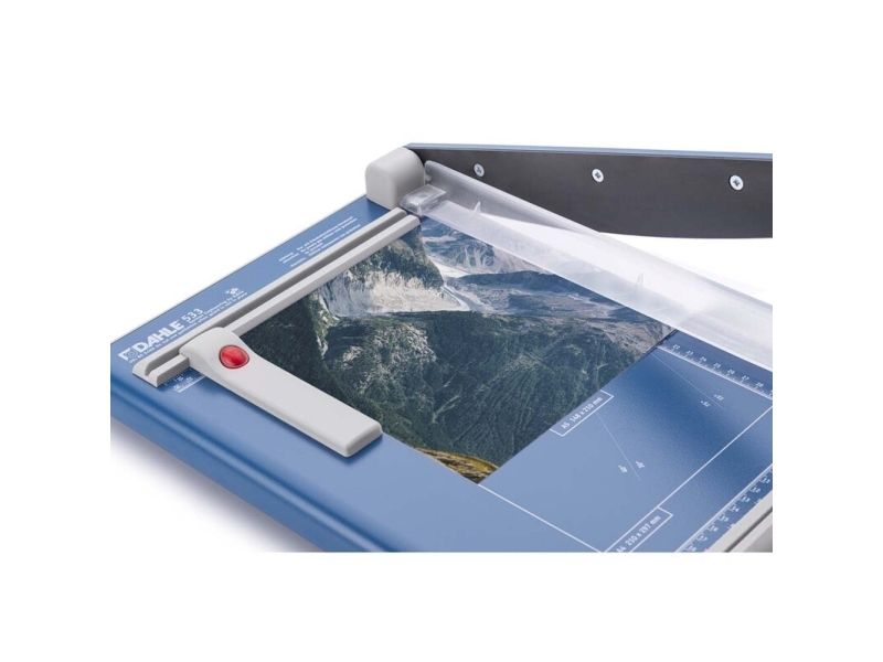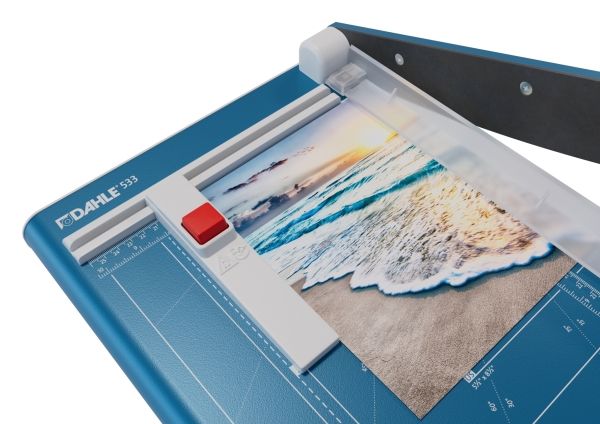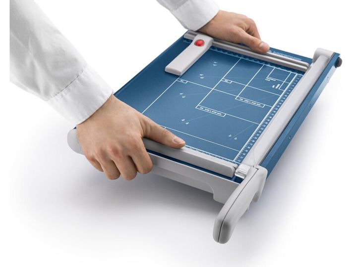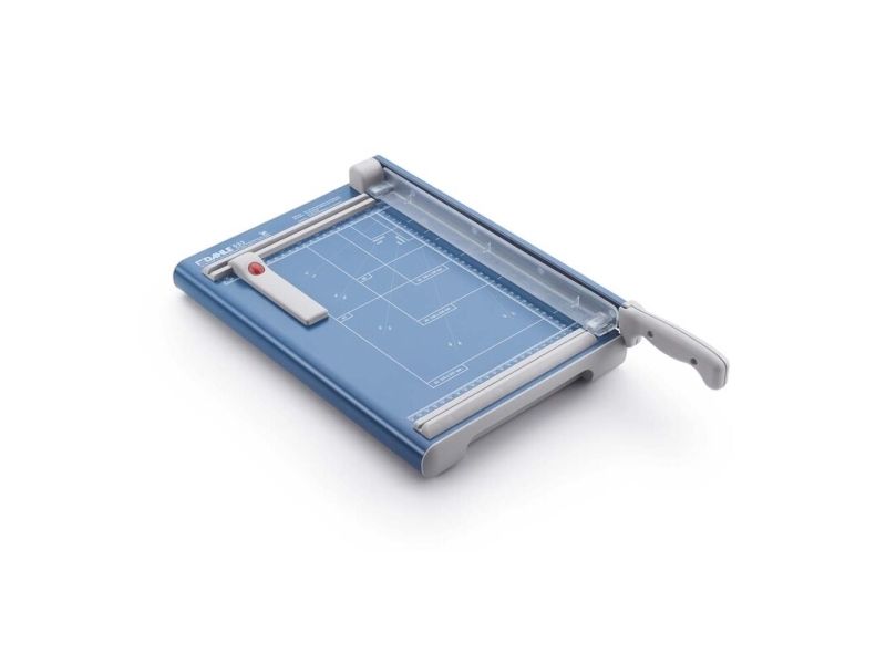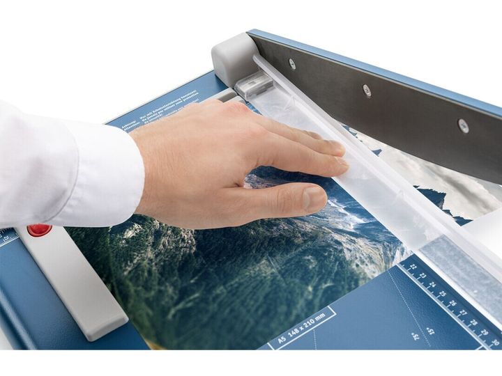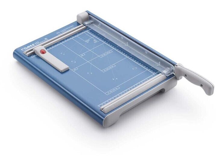 Skæremaskine med arm 533 Skæremaskine med arm og stabilt metalbord. Fastskruet planslebet øvre kniv og slebet nedre kniv af Solinger knivstål, håndpresse med integreret fingerbeskyttelse, 2 vinkelanlæg og indstillelig bagside. God bærekomfort med grebsfordybninger. God bærekomfort med grebsfordybninger