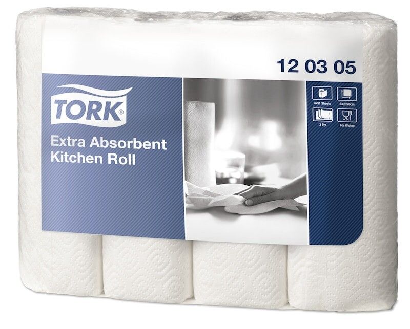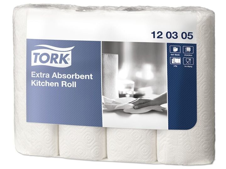 Tork ekstra absorberende køkkenrulle er velegnet til aftørringsopgaver i hverdagen, som fx aftørring af overflader, vand og olie eller opsamling af madrester.