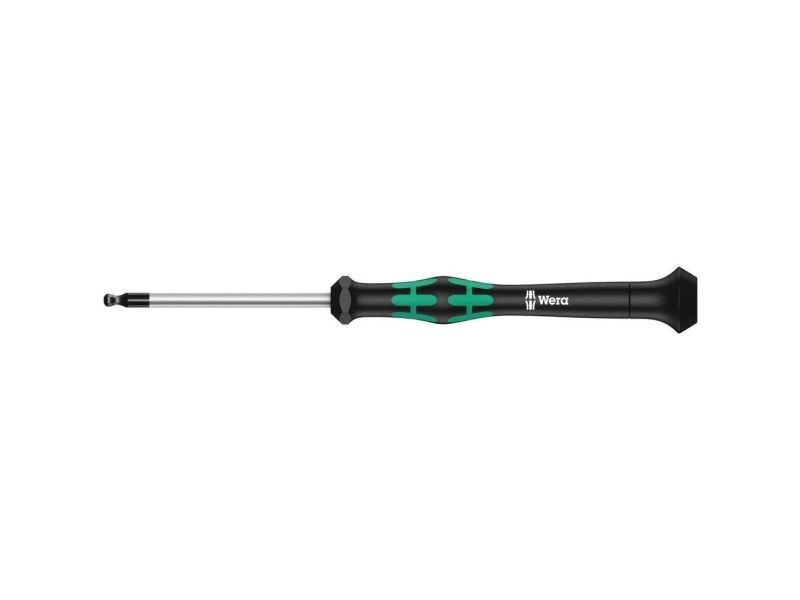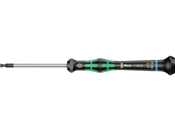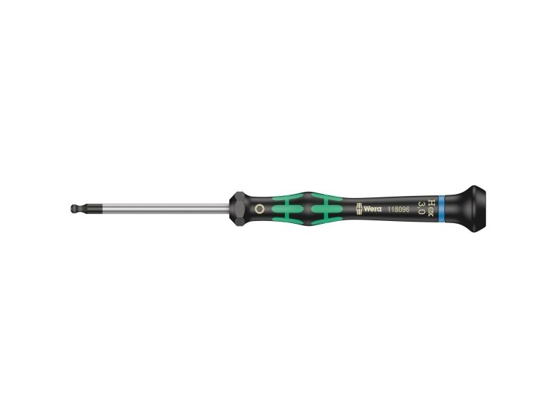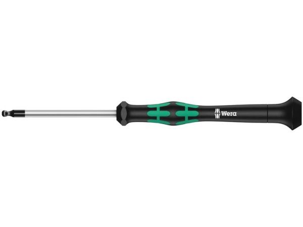 Wera Micro-skruetrækker til finmekaniske forskruninger. Med sekskantet kuglehoved på lange ben: Gennem de kugleformede afdriftsprofiler er en drejning eller svingning af værktøjsaksen til skrueakse mulig, så der kan skrues om hjørner. Ved at understøtte hånden på drejehætte og med hurtigdrejezonen under drejehætte er lynhurtigt skruearbejde muligt. Tidsintensiv drejninger bortfalder. Kraftzone med integrerede bløde zoner sørger for overførsel høje frigivelses- og tilspændingsmomenter. Præcisionszone for den rigtige drejevinkel ved justeringsarbejde. Wera Black Point-spids giver nøjagtighed og optimeret korrosionsbeskyttelse.