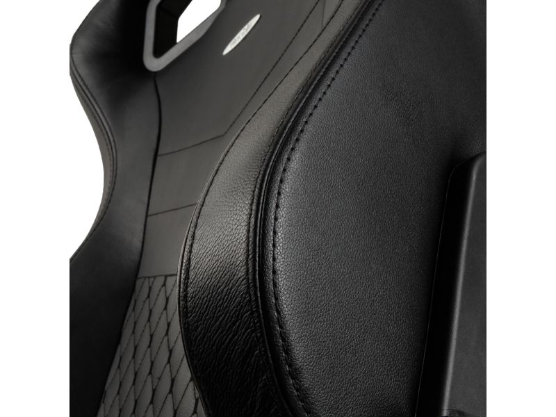 All of the black seams at the hems and on the backrest of the gaming seat were woven in by industrial embroidery machines with utmost accuracy and exact precision. How much love for detail has slipped into the design of the EPIC series is also shown by its numerous niceties. A subtly debossed crown logo adorns the headrest, while an elliptical aluminium emblem with relief lettering has been placed on the backrest. Lastly, the right side of the seat area is being accentuated by a leather segment with a golden logo embroidery.