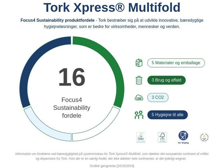 • Attraktivt Tork bladmotiv: Designet til at give et godt indtryk • Et stort, blødt håndklædeark, der giver en oplevelse af høj kvalitet • QuickDry™ – vores stærke, mest absorberende papir til effektiv aftørring med mindre spild • Én-ad-gangen dispenserfunktion reducerer forbruget og giver bedre hygiejne