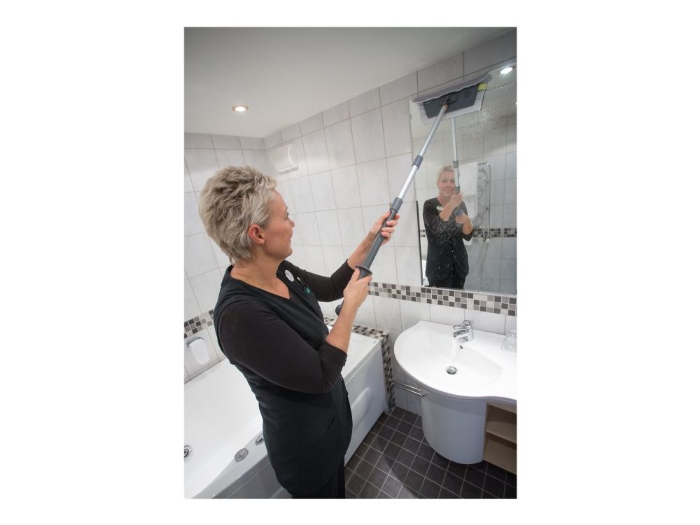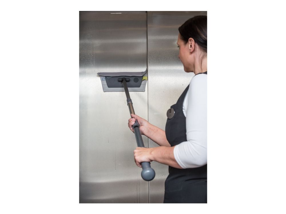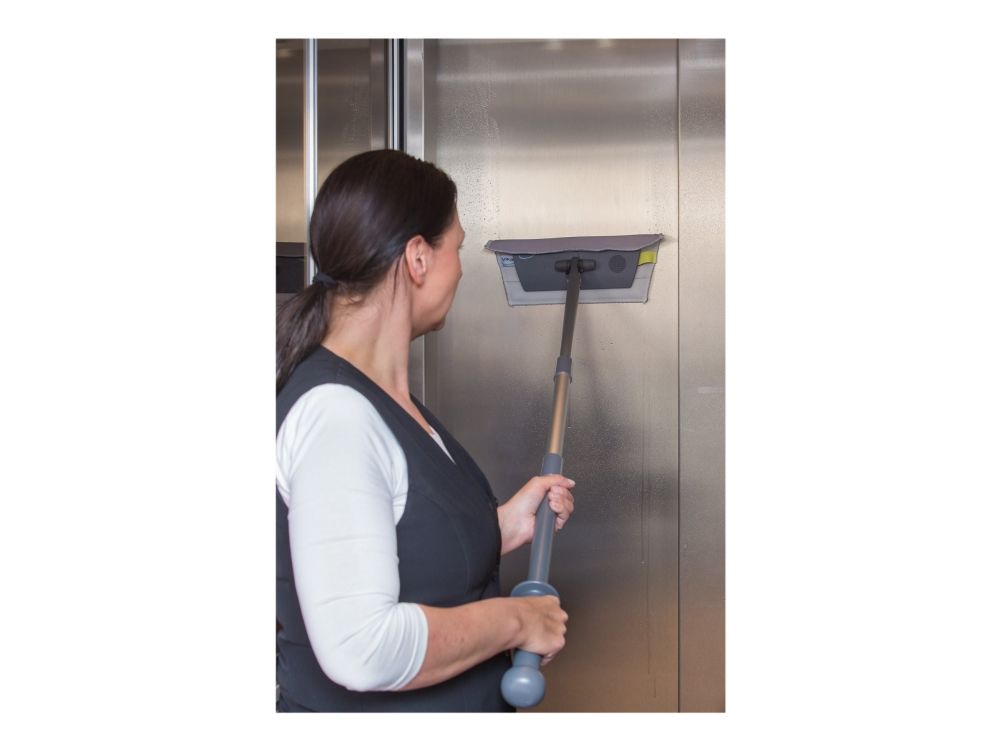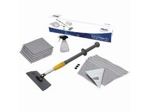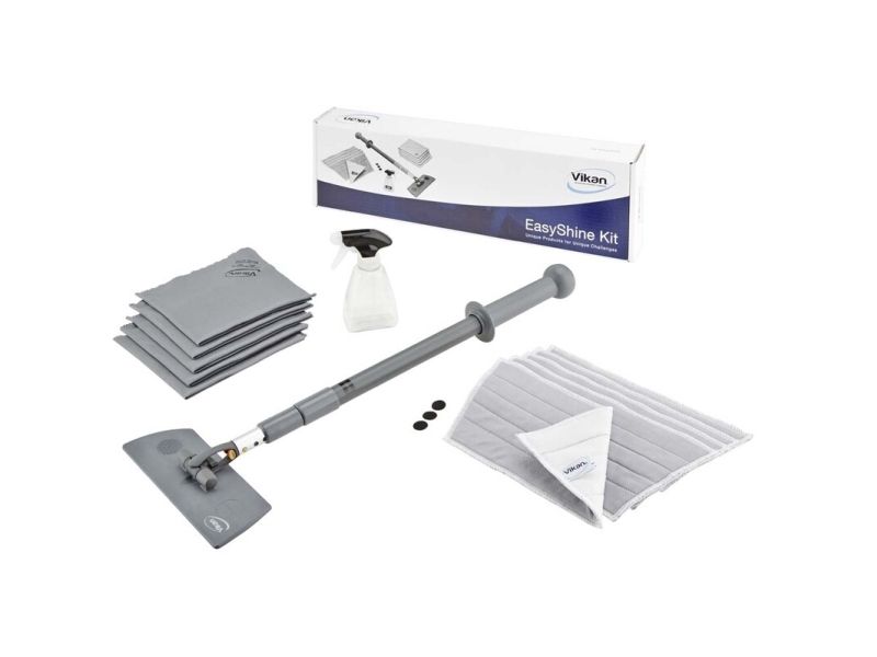 Vikan Easy Shine Kit med fleksibel moppefremfører er en komplet løsning til rengøring af vinduer, spejle, fliser, rustfrit stål, whiteboards og andre højglanspolerede overflader, herunder buede flader som svingdøre, badekar, jacuzzier, buede plastiksæder og bilruder. Sættet indeholder 5 vinduesmopper, 5 klude, 1 sprayflaske, 1 Ultra Flex moppefremfører og 1 teleskopskaft.