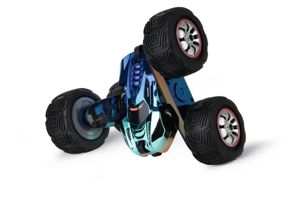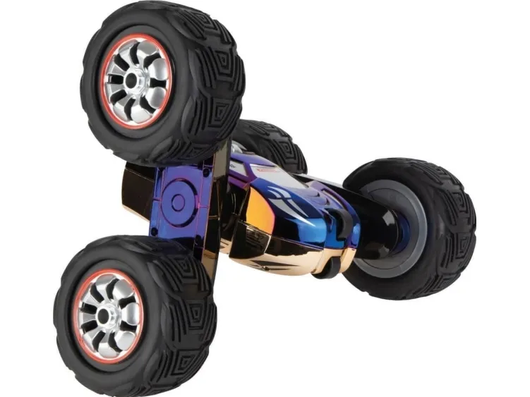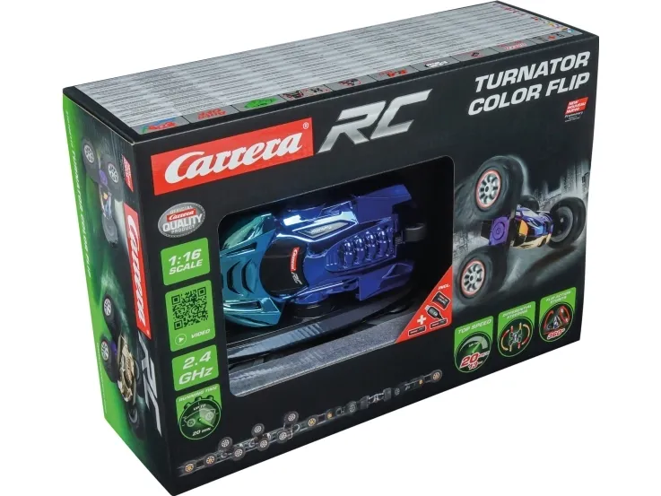 Oplev betagende stunts med Turnator Color Flip! Denne fjernstyrede action-STUNTCAR i målestoksforholdet 1:16 begejstrer med storslåede konvolutter og 360 ° -stunts. Chamelone-effektlakering skifter farve alt efter synsvinkel, mens LED-LYSET sørger for godt udsyn om natten. Stænkvandsbeskyttet og med separat kontrollerbare akser giver den maksimal køreglæde med en TOPHASTIGHED på 20 km/t. Takket være robust karosseri, fuldt affjedret chassis og genopladeligt high-tech LiFePo BATTERI har det en lang levetid og klar til en masse action. Perfekt som gave til børn og-fans fra 6 år.