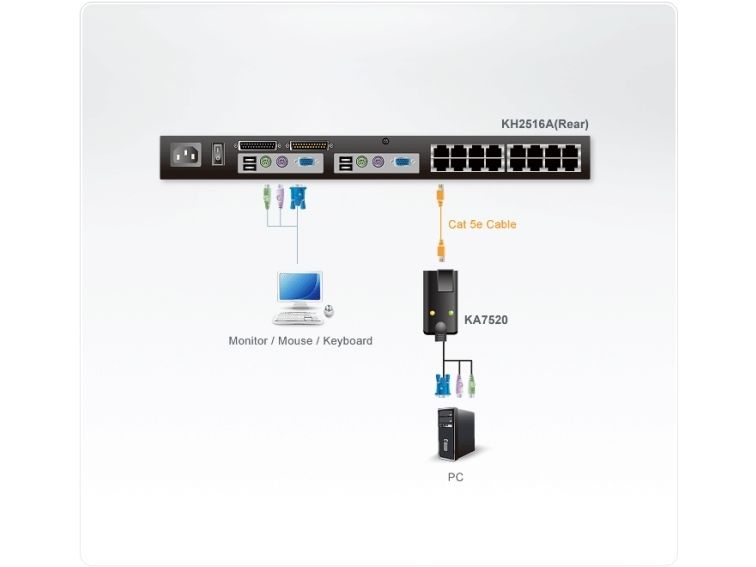 The KA7520 PS/2 KVM Adapter Cable connects the KVM switch to the video, PS/2 mouse and PS/2 keyboard ports of the target computer. With its small form factor and light weight design, it fits perfectly into most of the rack-mount or desktop servers.