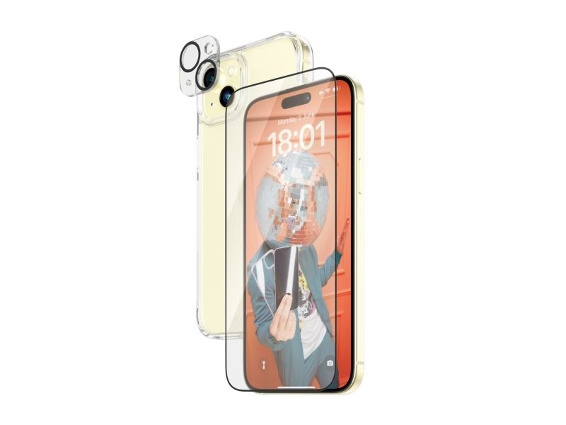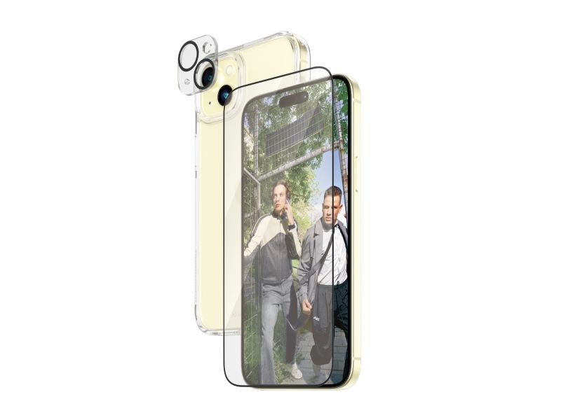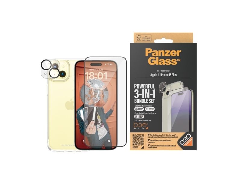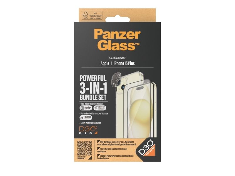 PanzerGlass - 3-i-1 Pakke - skjerm / linse / bakbeskyttelsessett for mobiltelefon - glass - rammefarge svart - for Apple iPhone 15 Plus