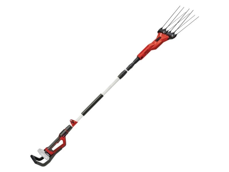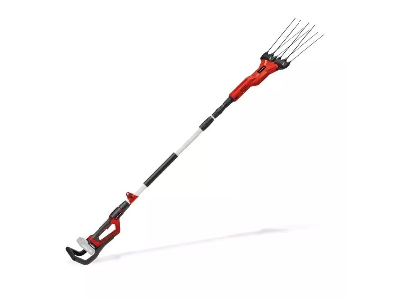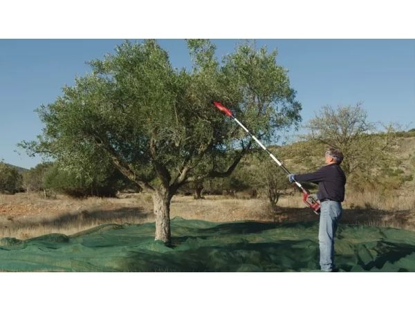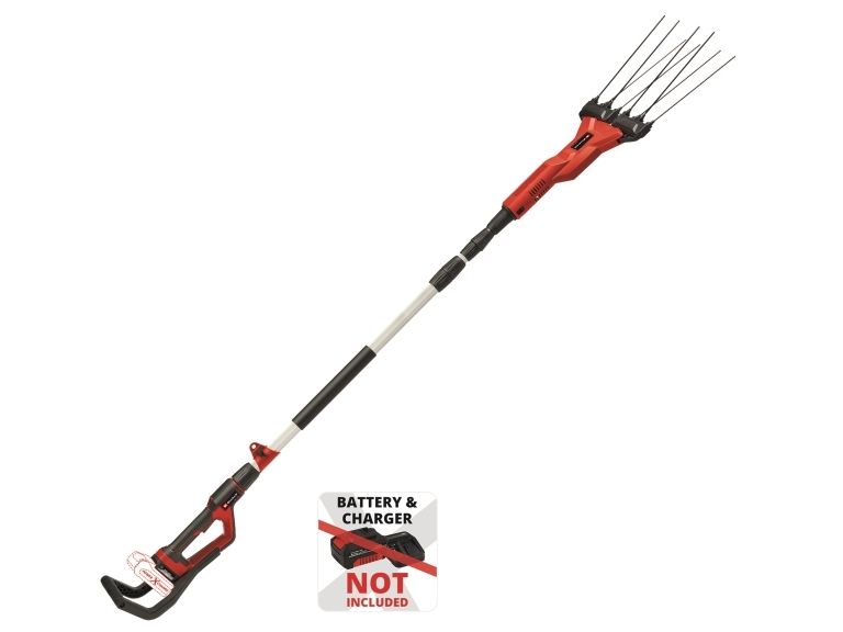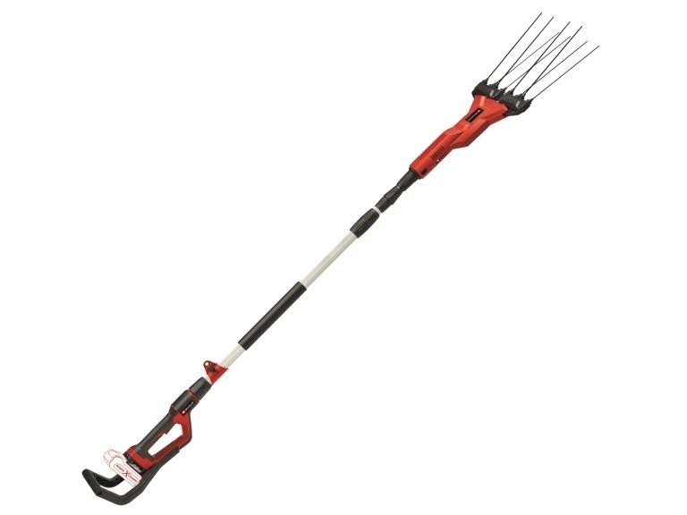 Einhell batteri-oliven-/frugtryster GE-FS 18/53 Li-Solo Medlem af Power-X-Change familien, 1x 18 V-batteri nødvendig Stor arbejdsbredde til hurtig arbejdsgang Robuste og lette 31 cm lange fingre af karbon Nem udskiftning af udskiftelige fingre Regulering af omdrejningstal for optimal tilpasning af hastigheden Kontinuerlig drift for komfortabelt arbejde over længere tid Trinløst teleskopskaft i aluminium Bageste ekstra greb til bedre opnåelse af høje grene Med Einhell batteri-oliven-/frugtryster GE-FS 18/53 Li-Solo bliver høsttiden til en leg. Uanset om det er frugttræ eller oliventræ - med kraftfuld batteri-power ruster det lette, praktiske apparat enhver frugt ud af grene. Batteri-frugt-/oliventræskeren er en del af Power-X-Change familien, hvor alle batterier, apparater og opladere kan kombineres fleksibelt med hinanden. Hamekam arbejder med en konstant sidebevægelse og en arbejdsbredde mellem 28 og 53 cm gennem grene. De 8 stabile, 31 cm lange fingre af carbon rubler giver således frugten eller olivenerne af grene. Hastigheden for denne bevægelse kan reguleres med et drejeknap. De enkelte carbon-fingre kan nemt skiftes ud. For også uden problemer at nå større grene kan den samlede længde af den elektriske høster indstilles mellem 220 og 310 cm med teleshfunktion. Desuden gør det bageste ekstra greb det lettere at nå højden. Ved tidskrævende arbejde sørger den kontinuerlige funktion og den bekvemme håndtering takket være det specielle softgrip-flader for aflastning. Den justerbare bæresele muliggør en optimal vægtfordeling. En praktisk vægholder til pladsbesparende opbevaring medfølger. Leveres uden batteri og oplader, disse fås separat, for eksempel som startsæt.