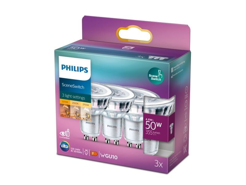 Philips SceneSwitch - LED-pære for søkelys - GU10 - 1.5/3.5/4.8 W (ekvivalent 50 W) - klasse F - varmhvitt/flammelys - 2200/2500/2700 K (en pakke 3)